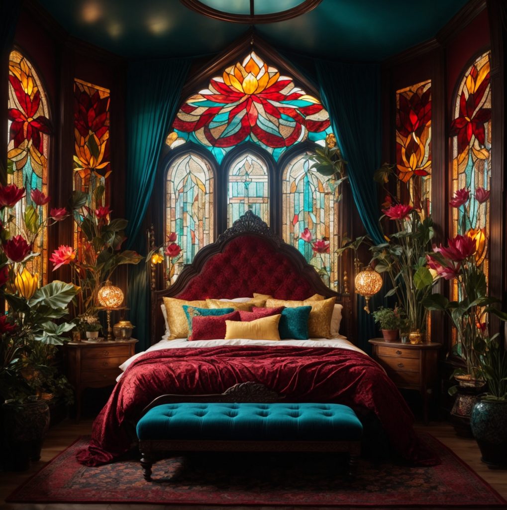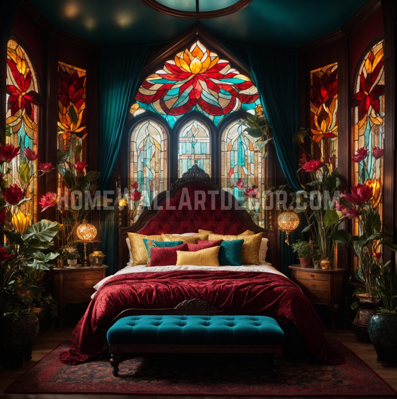 Lotus Flower wall art exudes an enigmatic allure, drawing the observer into a world where elegance and tranquility coexist. Each piece, meticulously crafted, is more than a visual feast; it’s a soulful journey. The deep, resonant hues of the lotus blooms encapsulated in stained glass windows, as depicted in the image above, infuse an otherworldly grace into the bedroom.