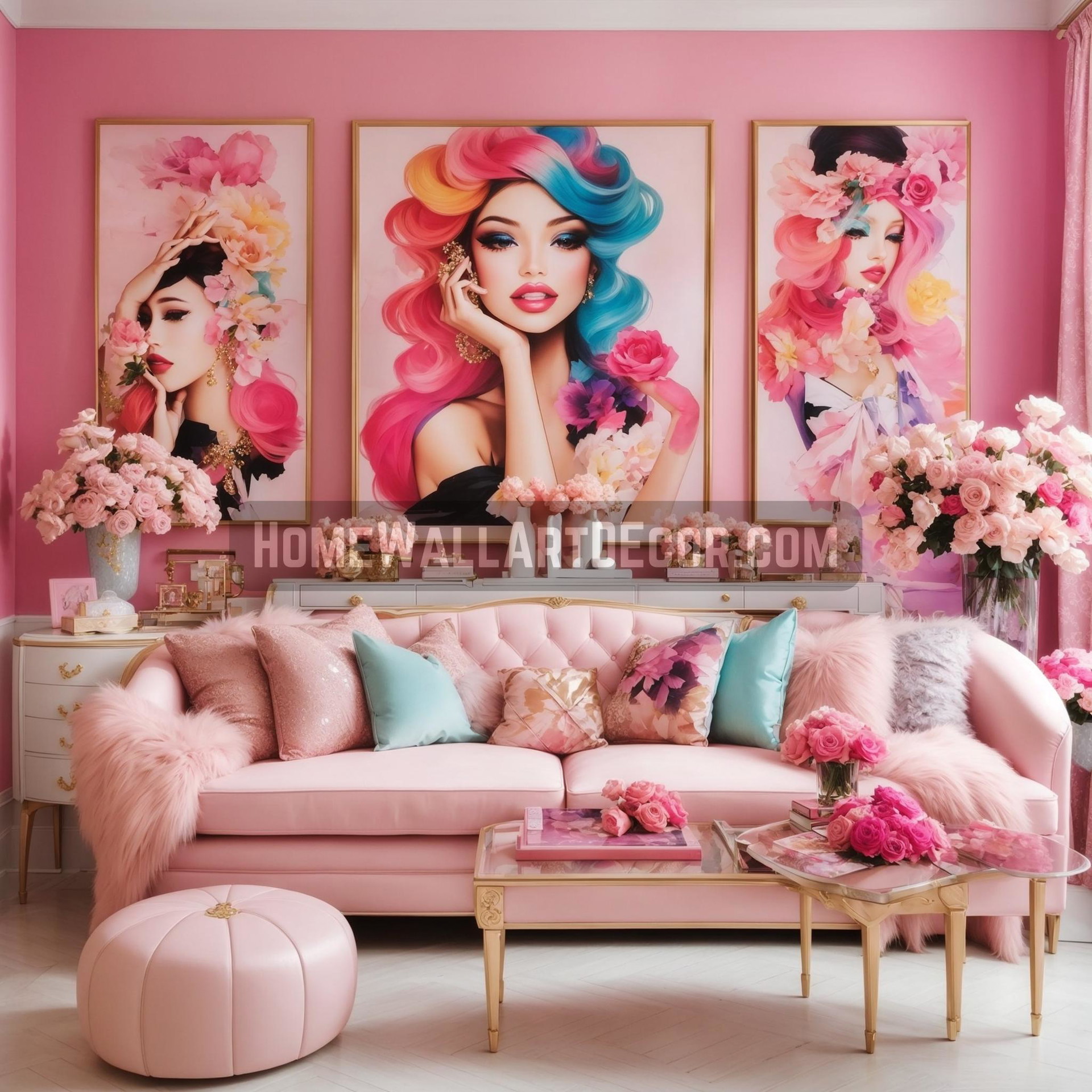 Incorporating such wall art into interiors is not just about aesthetics; it’s a statement of personal style. A plush pink couch, accentuated with pillows of varying textures and colors, becomes a sanctuary of relaxation and style. The strategic placement of fresh blooms and chic decorative pieces further accentuates the room’s fashion-forward vibe.