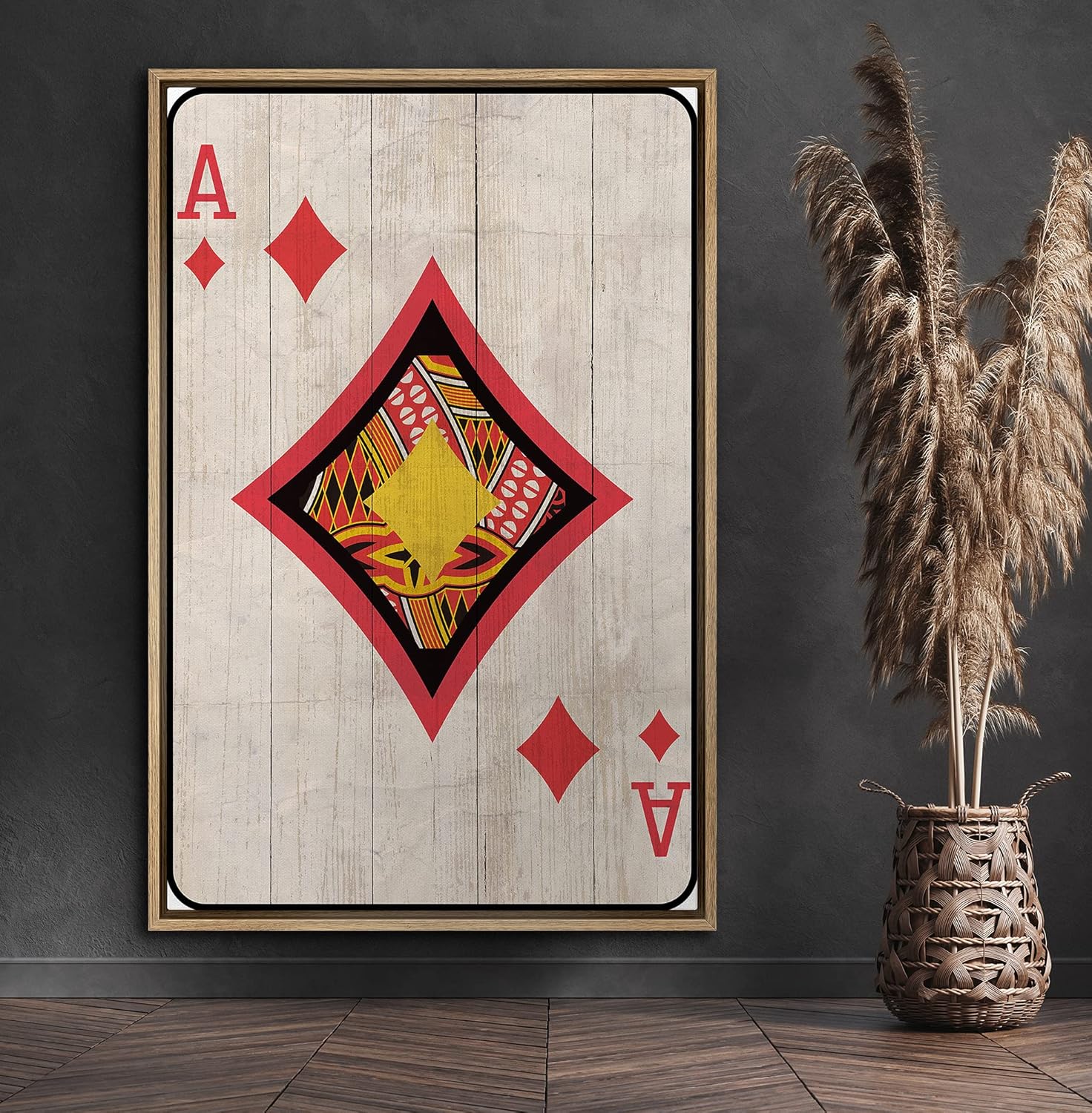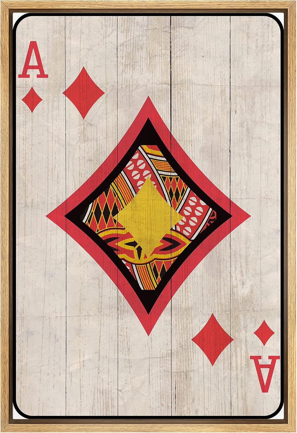 Transform your space with ‘Ace in Deck of Cards Wall Art: Pop Culture Wall Decor,’ a striking piece that merges classic gaming symbolism with contemporary artistry. Featuring the ace of diamonds, this artwork is vividly rendered against a faux wood panel background, creating a unique juxtaposition of old and new elements. The vibrant colors and sharp geometric designs enhance the visual appeal, making it a standout addition to any room. It’s a perfect blend of nostalgia and modern style, ideal for game rooms, living areas, or offices.