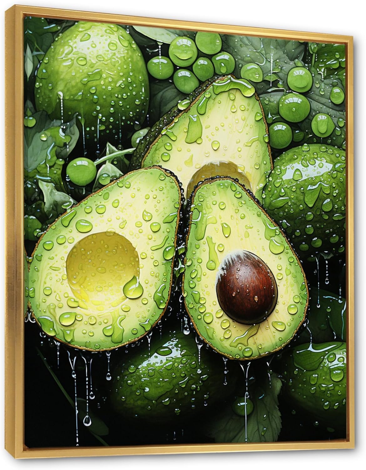 The colors in this artwork are meticulously crafted to highlight the natural beauty and texture of avocados. The lush greens and vibrant yellows of the fruit are rendered with such detail that they seem to leap off the canvas, while the glistening water droplets add a sense of realism and freshness. The warm, golden frame complements the richness of the artwork, making it a versatile piece that can fit seamlessly into a variety of decor styles.