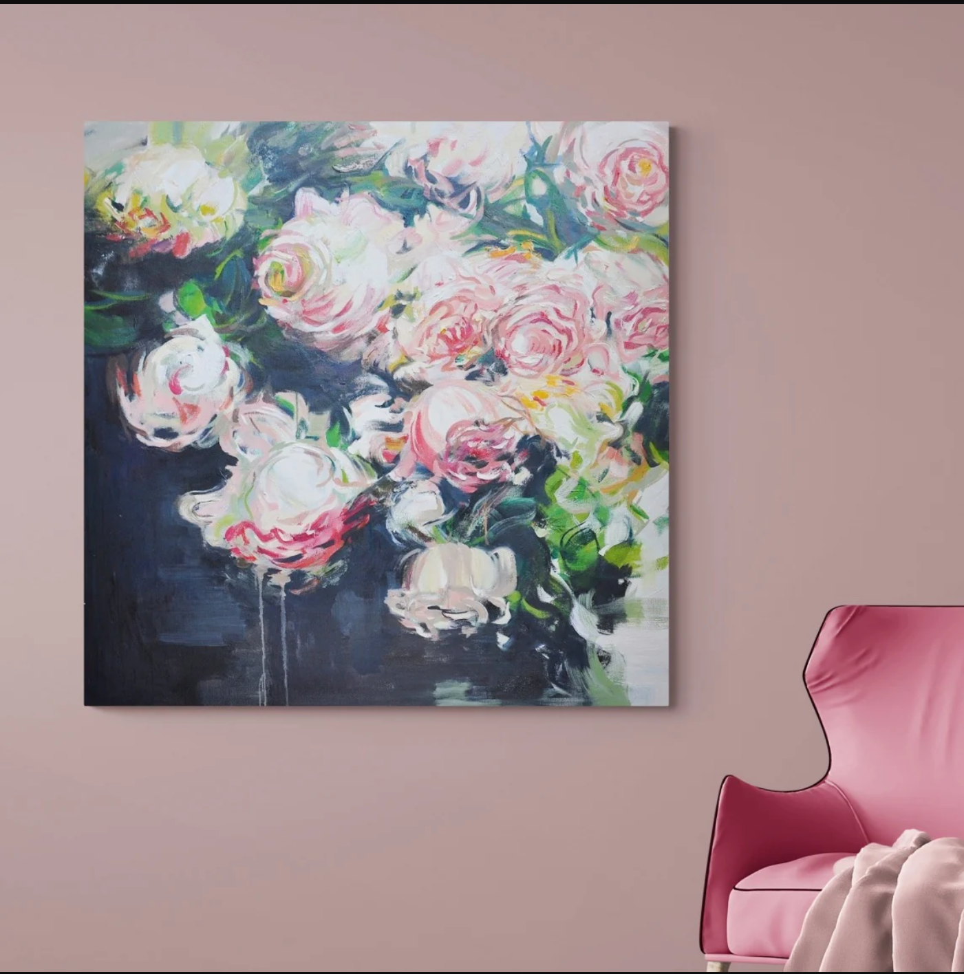 The contrasting background serves as the perfect foil to the bright florals, its deep tones setting off the delicate colors of the roses, giving them a luminescent quality. This thoughtful use of contrast not only highlights the beauty of the flowers but also adds a contemporary edge to the piece, making it a perfect fit for modern interiors.