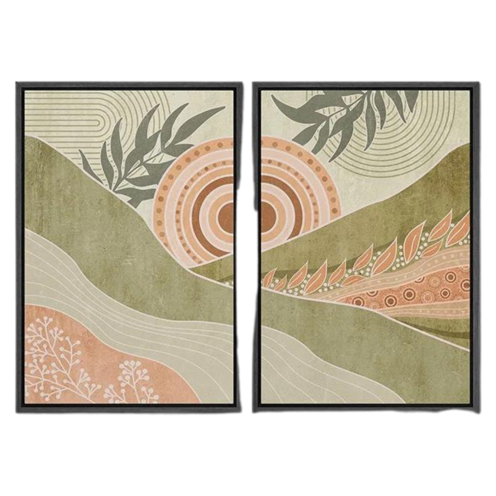 The Boho Pastel Green Nature Wall Art showcases a unique blend of mid-century modern aesthetics with boho-inspired elements. The subtle, flowing lines and geometric patterns create a sense of movement, while the earthy green and soft peach tones offer a grounded, natural feel. This combination of styles makes it a versatile piece that can complement a variety of interior design themes, from contemporary and minimalist to bohemian and farmhouse.