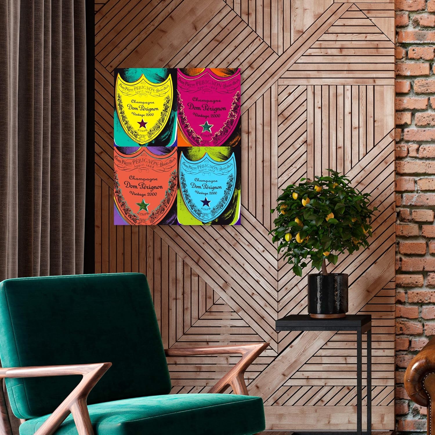 Experience the dynamic energy of this champagne wall art, where each label is rendered with exquisite detail and vibrant hues. The juxtaposition of classic luxury and modern pop art creates a unique and captivating visual experience. Whether displayed in your living room, dining area, or home bar, this artwork becomes a focal point that draws admiration and conversation. The rich textures and bold colors make it a statement piece that enhances any decor style. Embrace the allure of pop art with this stunning Warholesque Dom P piece.
