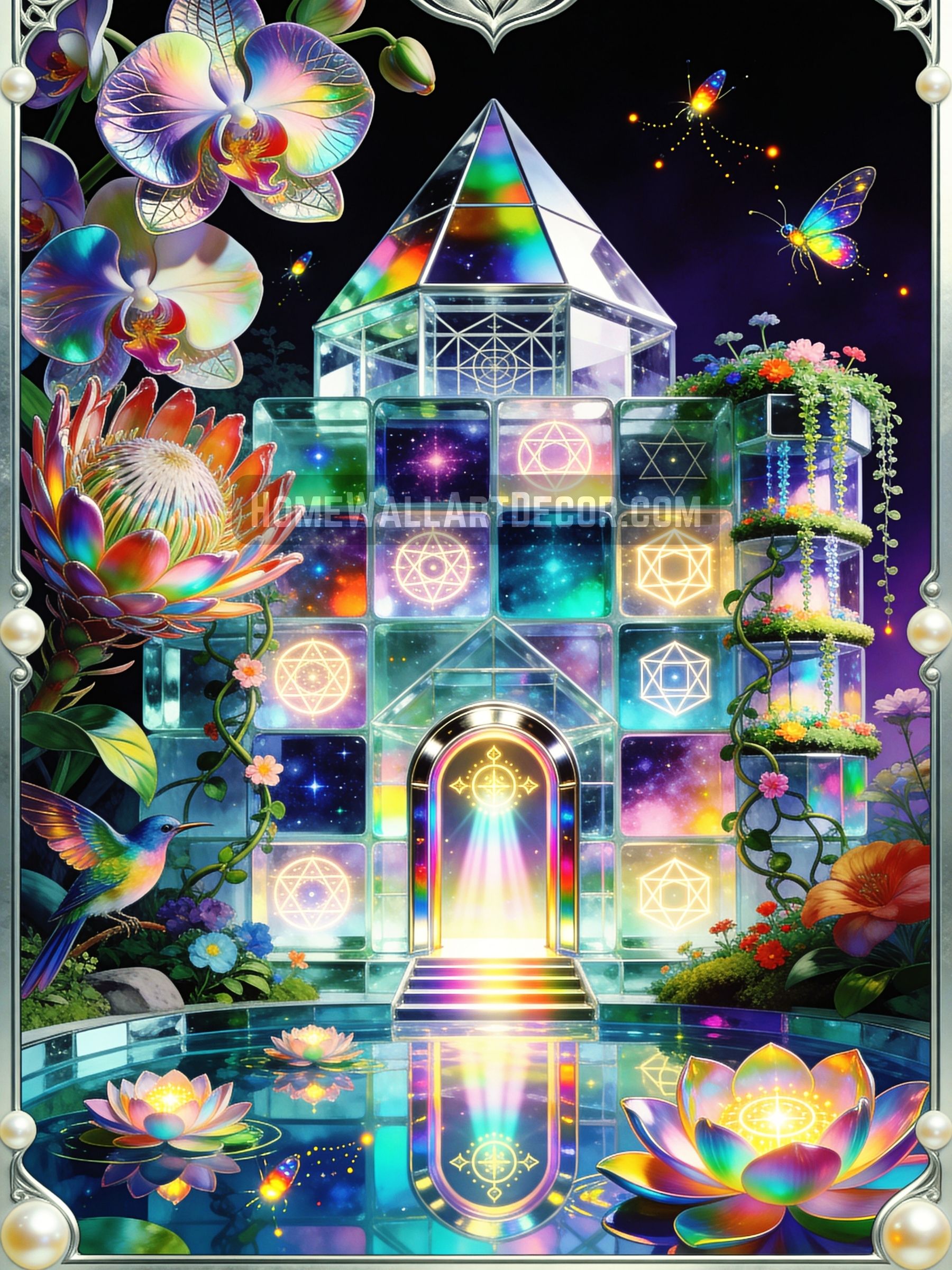 Chakra healers and energy workers will recognize this crystal temple art as seven-chakra activation tool, the rainbow light beam descending from arched doorway stimulating all energy centers simultaneously. The rainbow iridescence throughout orchids, lotus flowers, protea, and temple surfaces corresponds to chakra colors, creating visual field that harmonizes your own subtle body’s rainbow nature. Position this crystal temple art as focal point during chakra meditation and allow the rainbow emanations to activate corresponding energy centers. The crystalline transparency suggests energetic clarity, the removal of blockages allowing light to flow unobstructed through all channels.