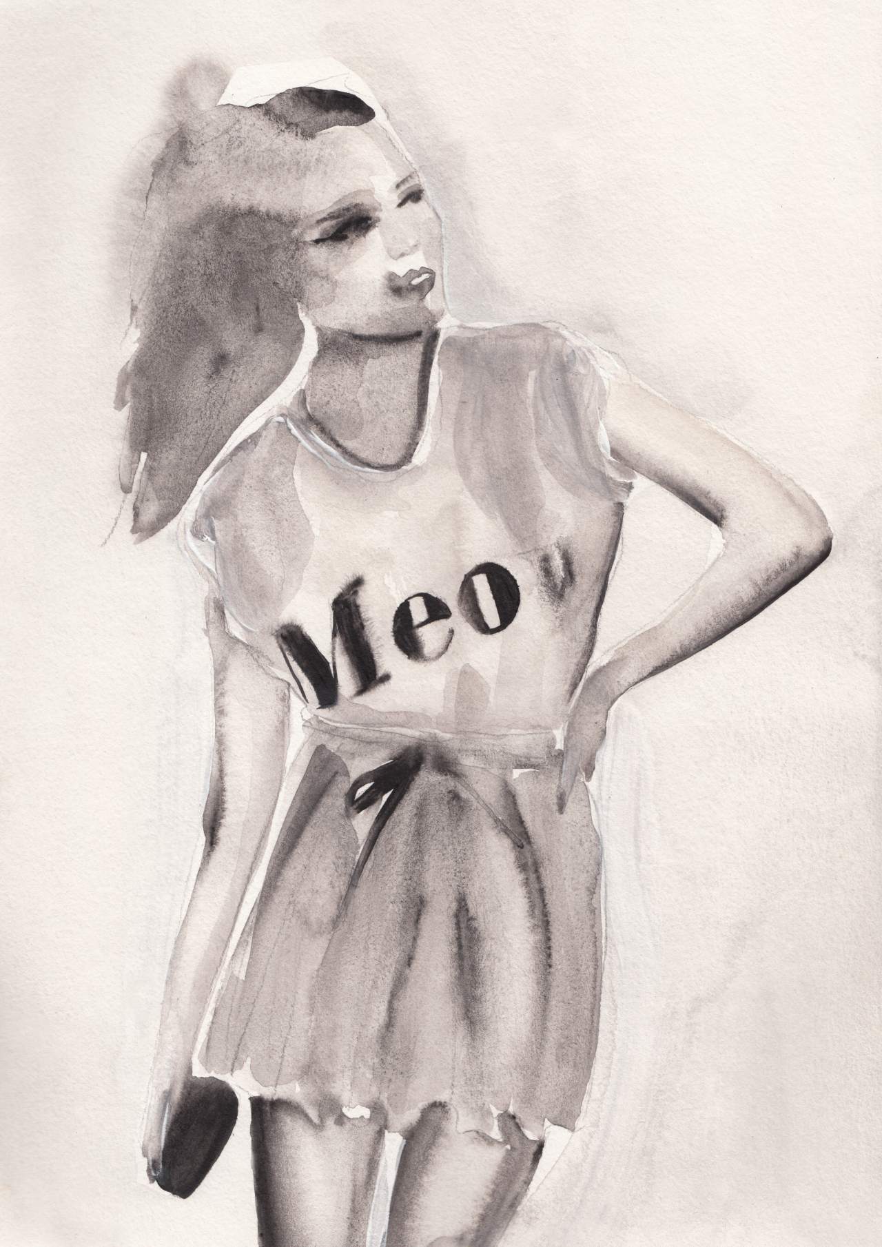 The piece features a young woman in a casual yet chic pose, her attire a nod to the off-duty model look that has infiltrated the high streets. The watercolor’s monochromatic palette is a testament to the simplicity of true elegance, with its soft grays and bold blacks dancing together on the textured paper. Her shirt, adorned with the word “Meow,” adds a quirky twist, suggesting a playful spirit beneath the poised exterior.