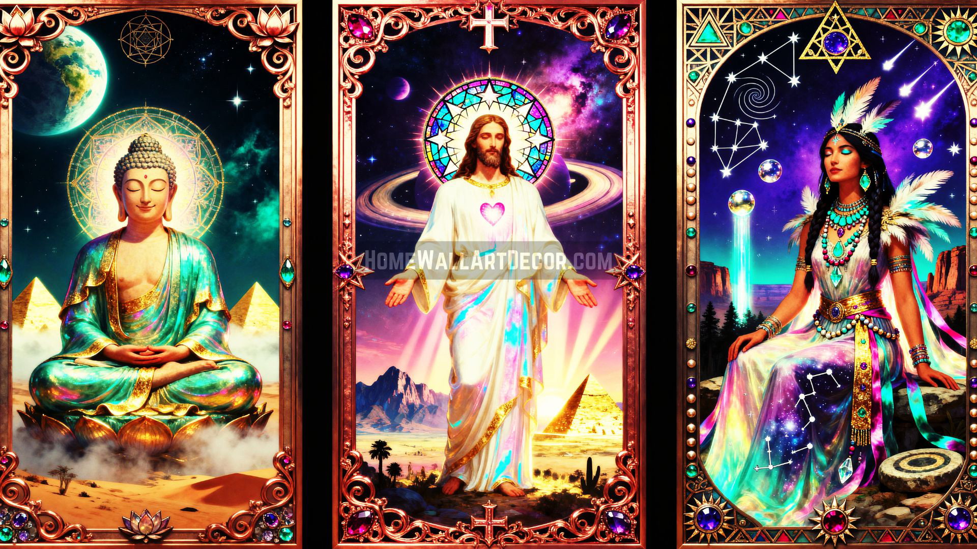Close your eyes. Now open them to a vision where boundaries dissolve and the divine reveals itself in three forms, three traditions, one luminous truth. This sacred triptych wall art captures the moment when Buddha’s serene enlightenment, Christ’s radiant compassion, and the Medicine Woman’s earthly wisdom converge beneath a shared cosmic sky. Ornate copper frames adorned with jewels, lotus blossoms, and baroque scrollwork cradle each figure like precious relics.