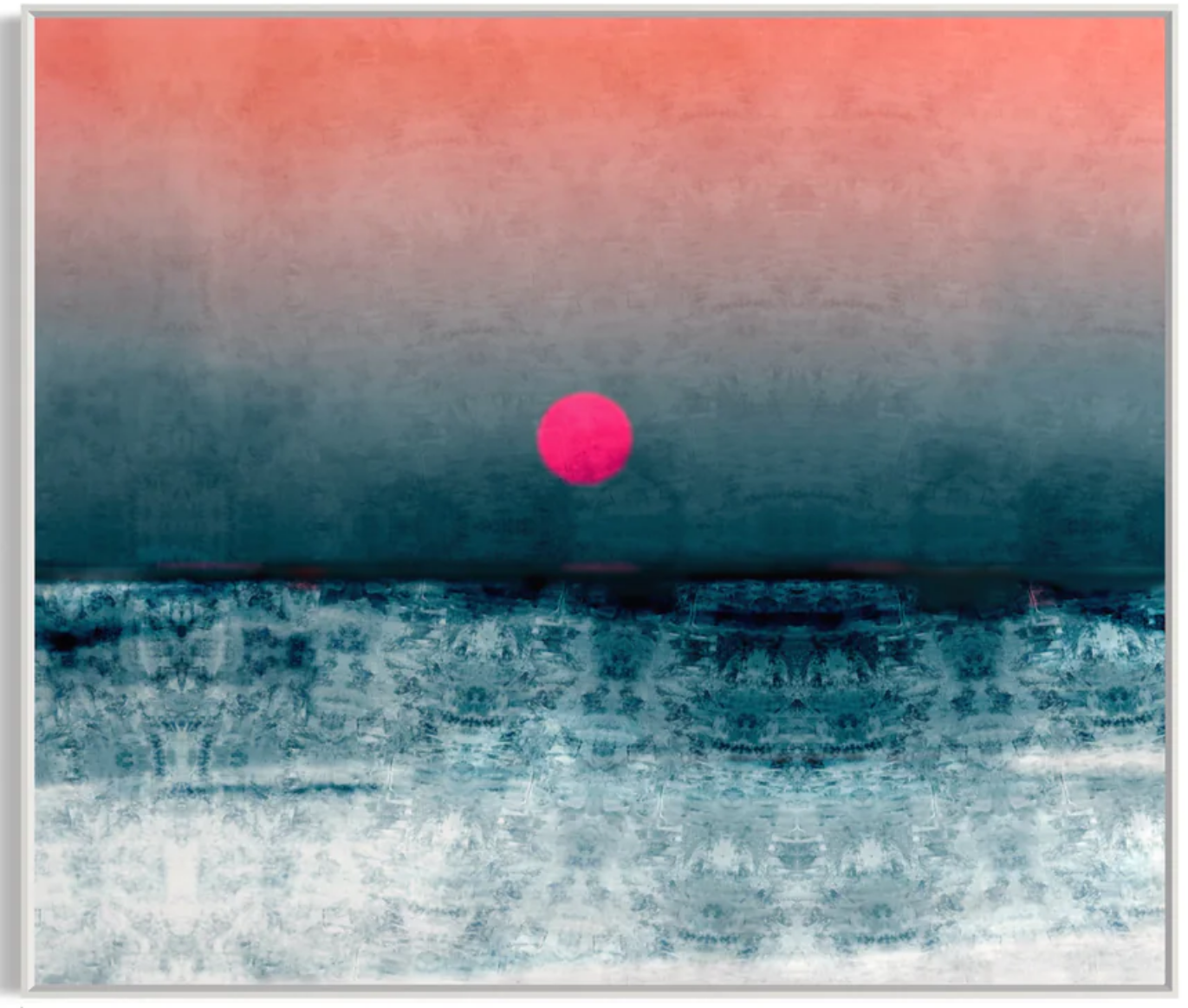 The artwork is a striking example of minimalism with maximum impact. A solitary pink orb hangs in the gradient sky, reminiscent of the setting sun or perhaps an early evening star, bringing a focal point that draws the viewer into a moment of reflection. This singular pop of color against the subdued background creates a sense of balance between loneliness and hope, between the vastness of the sky and the intimacy of personal experience.