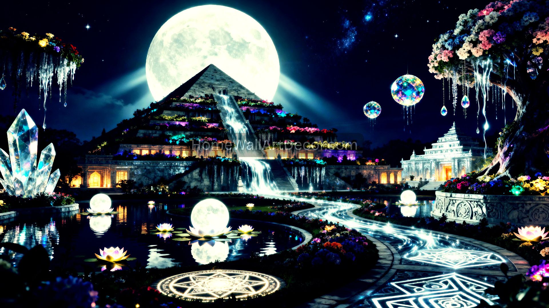 The massive full moon that crowns the image acts as the guardian of the scene. In spiritual traditions, the moon represents the subconscious, the intuitive self, the part of you that knows things without being told. By placing such a dominant lunar presence in this Fantasy Pyramid Wall Art, Pamela Arsena is calling on the viewer to trust their intuition. The floating crystal orbs and the giant quartz clusters in the foreground speak to clarity and amplification. They are the lenses through which we see the truth.