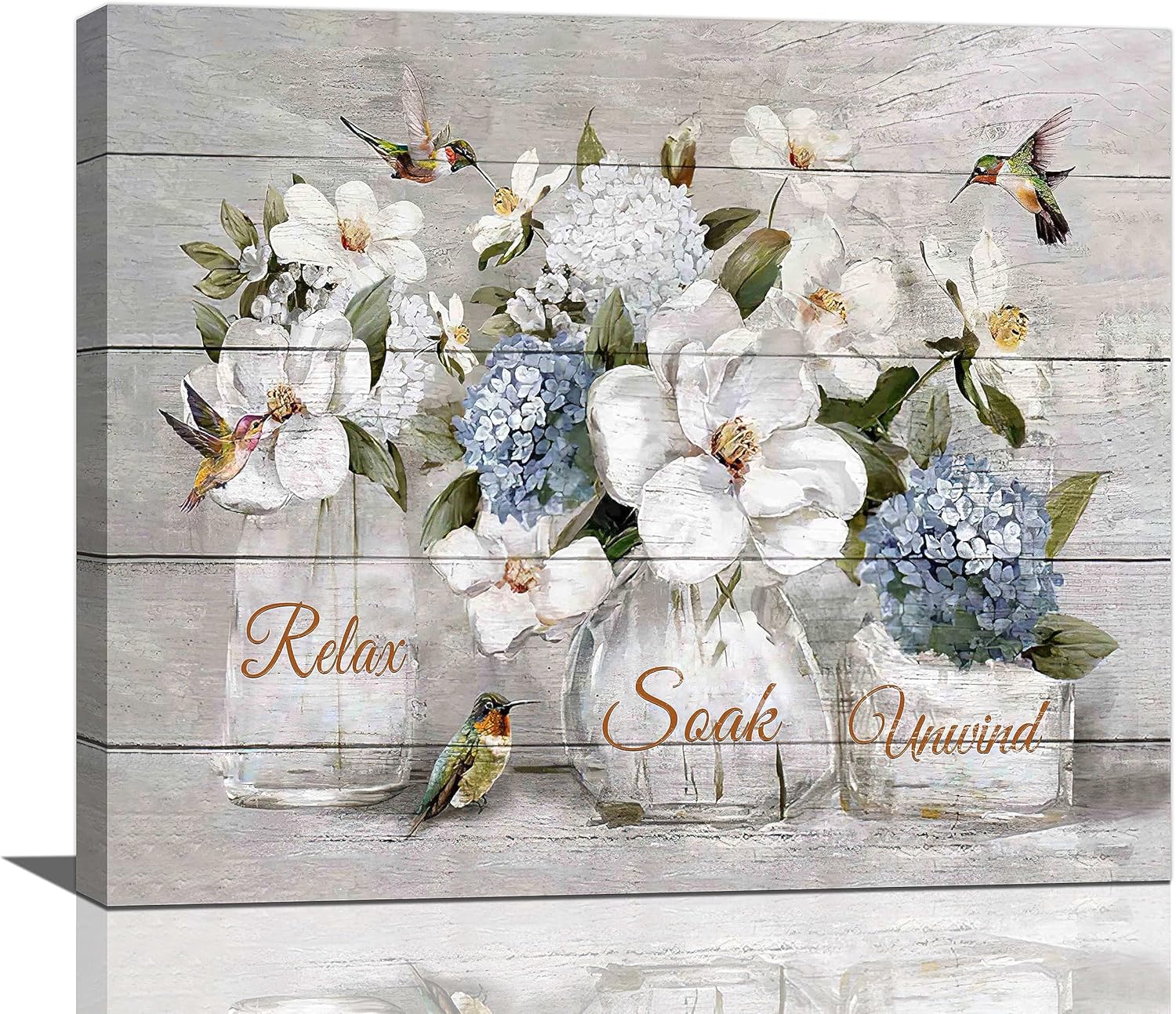 The Flower Decor Wall Art showcases a stunning combination of soft, neutral tones paired with muted blues and greens, creating a balanced and calming aesthetic. The white flowers stand out gracefully against the rustic wood texture, while the colorful hummingbirds add life and movement to the piece. The gentle script reading “Relax, Soak, Unwind” invites you to pause, breathe, and enjoy the peaceful energy this artwork brings. It’s the perfect addition to spaces where you want to encourage rest and relaxation.