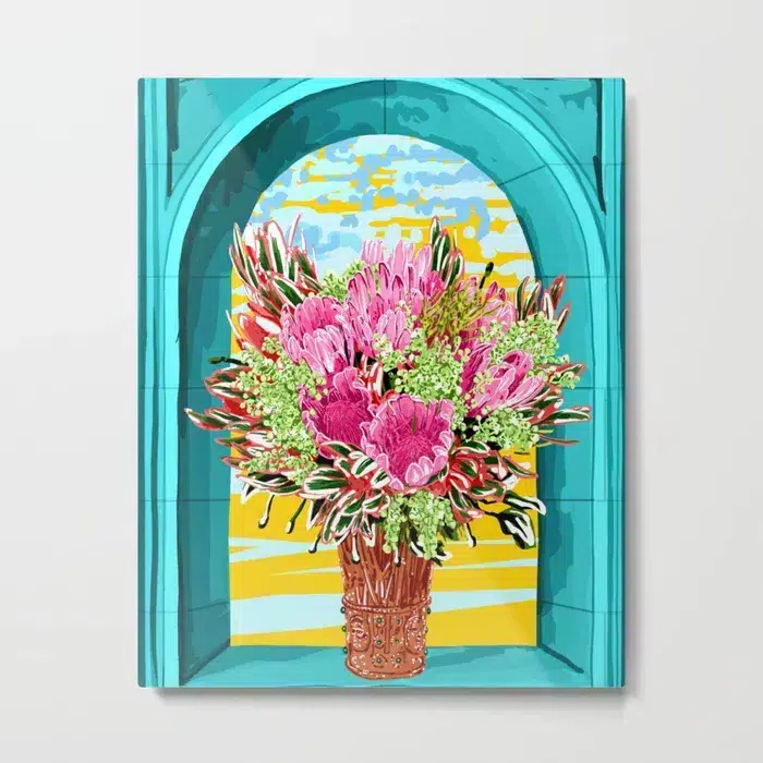 The combination of bold pinks, greens, and yellows creates an energizing visual experience, perfect for brightening up any room. The intricately designed flower arrangement bursts with life, while the cool blue archway adds a sense of tranquility and calm. This artwork is a beautiful blend of contemporary and traditional styles, making it suitable for a variety of home decor types, including Boho, Moroccan, or even modern Farmhouse. The flower pot metal wall art will immediately bring good vibes to any space it adorns.