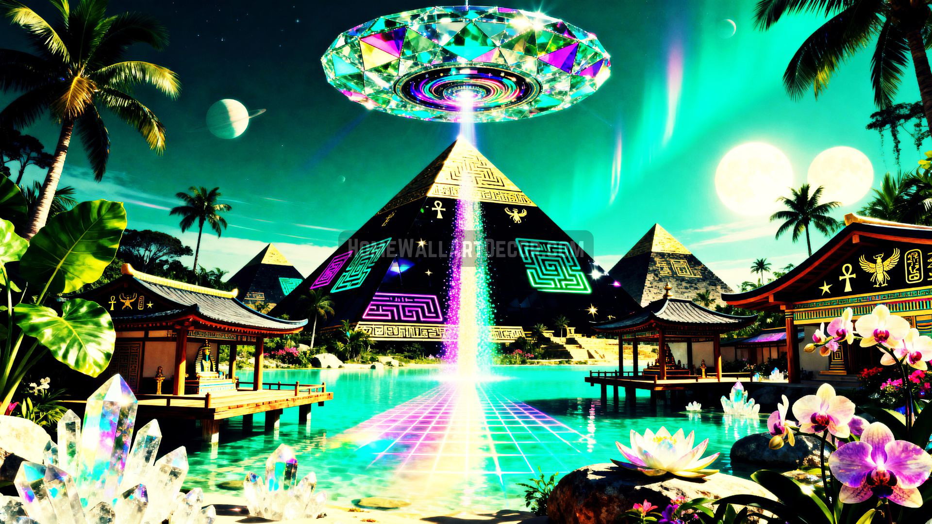 The air shimmers with auroras. Twin moons witness the convergence. Asian pagodas stand sentinel, their curved roofs honoring the feminine flow of energy while pyramids command the masculine ascent. Lotus flowers bloom in impossible colors, their petals open to receive transmissions. Crystals emerge from the earth like antennae, translating celestial frequencies into tangible beauty. Palm trees sway with tropical ease, reminding you that paradise and transcendence are not separate destinations. This futuristic cosmic pyramid art transforms every element into a singular vision: the awakening of planetary consciousness through cosmic contact.