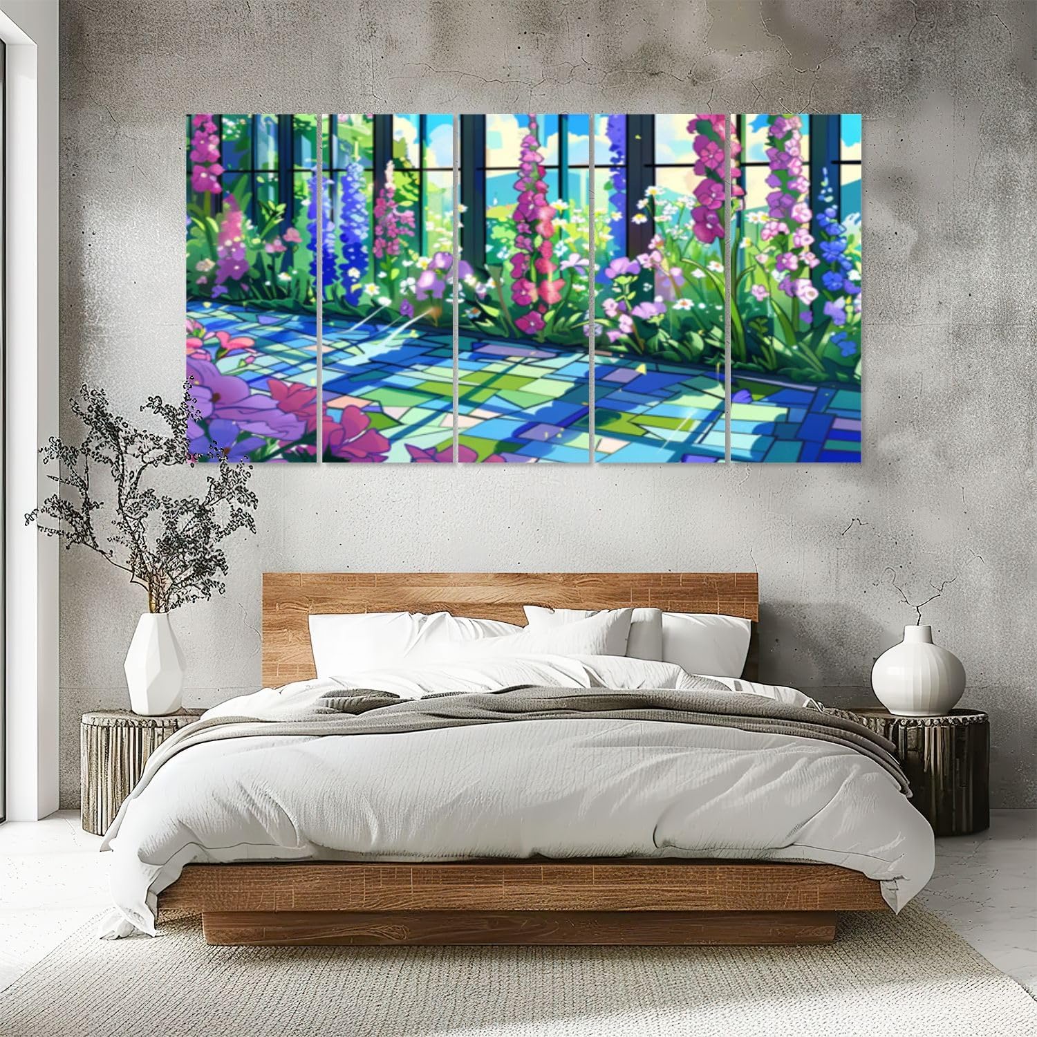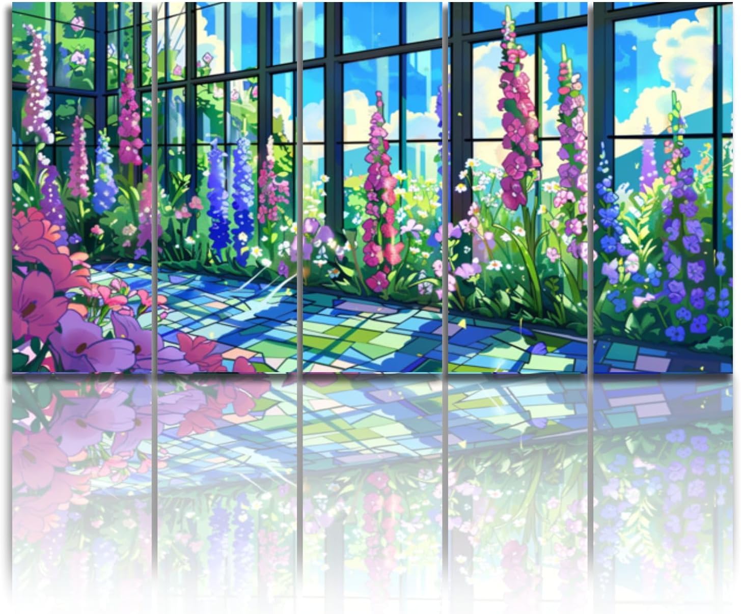 This mosaic garden wall art is a celebration of nature’s beauty, rendered in a way that evokes the timeless charm of stained glass. The vivid colors and delicate details of the flowers are expertly captured, creating a scene that feels both lively and calming. Each panel of this Garden Stained Glass Window Wall Art is designed to reflect light beautifully, making the colors come alive and casting a warm, inviting glow throughout your room.