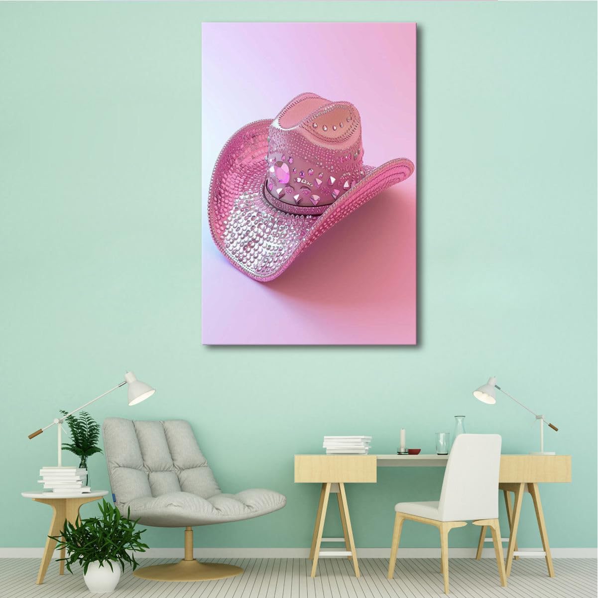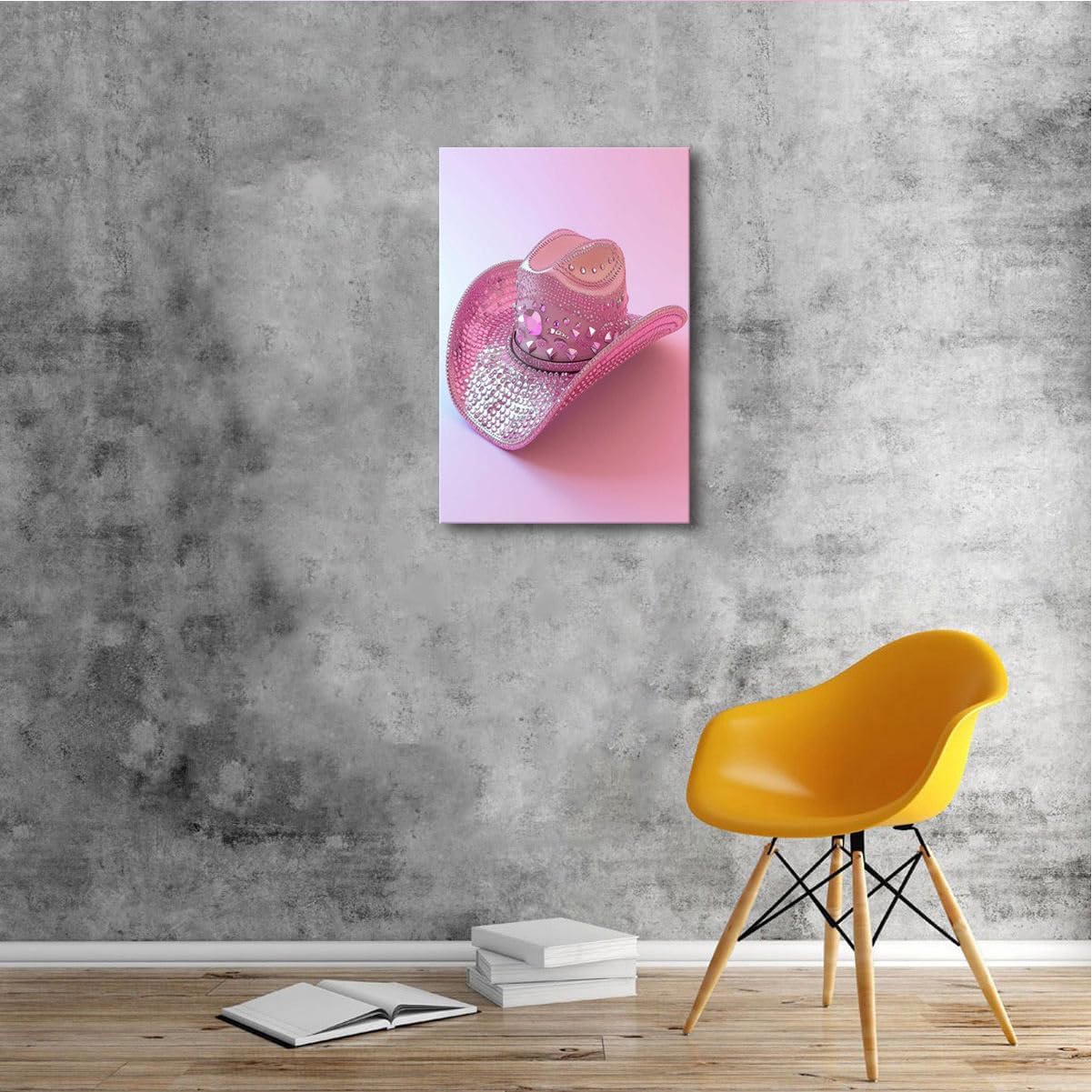 The ‘Glamorous Pink Rhinestone Cowboy Hat’ wall art is more than just a decorative piece; it’s an expression of personality and style. It invites viewers to appreciate the fusion of traditional Western elements with unexpected, glamorous details. This artwork is perfect for those who wish to infuse their home with a sense of adventure and luxury, making everyday spaces feel extraordinary.