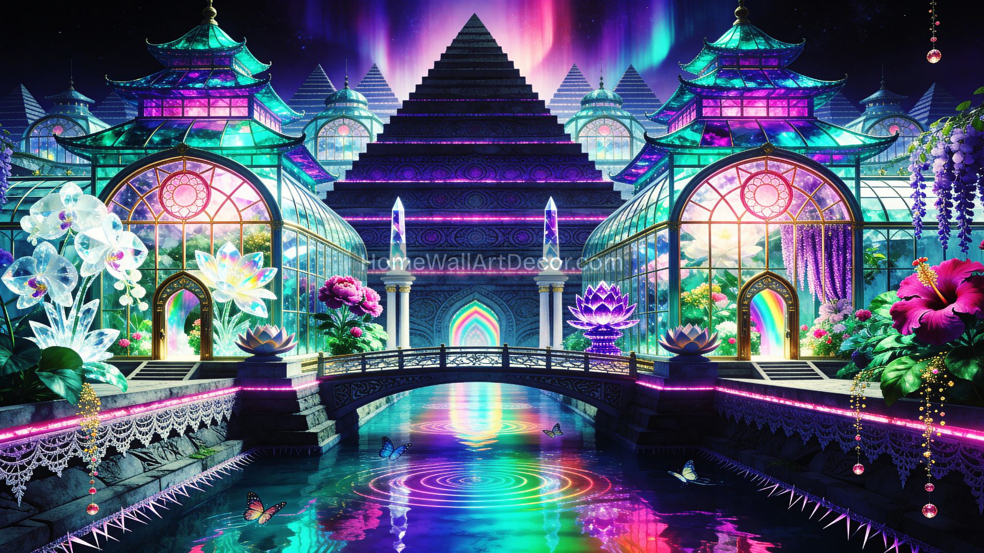 You stand at the threshold of a world that should not exist, yet pulses with undeniable presence. Twin glass conservatories rise like crystalline dreams on either side of an ancient dark pyramid, their iridescent panes catching light from auroras that ripple across impossible skies. A bridge spans reflective waters where butterflies trace patterns between worlds. White orchids and purple wisteria cascade through the air, perfuming the space between architecture and cosmos. This glass pyramid art does not simply hang on your wall. It opens a portal.
