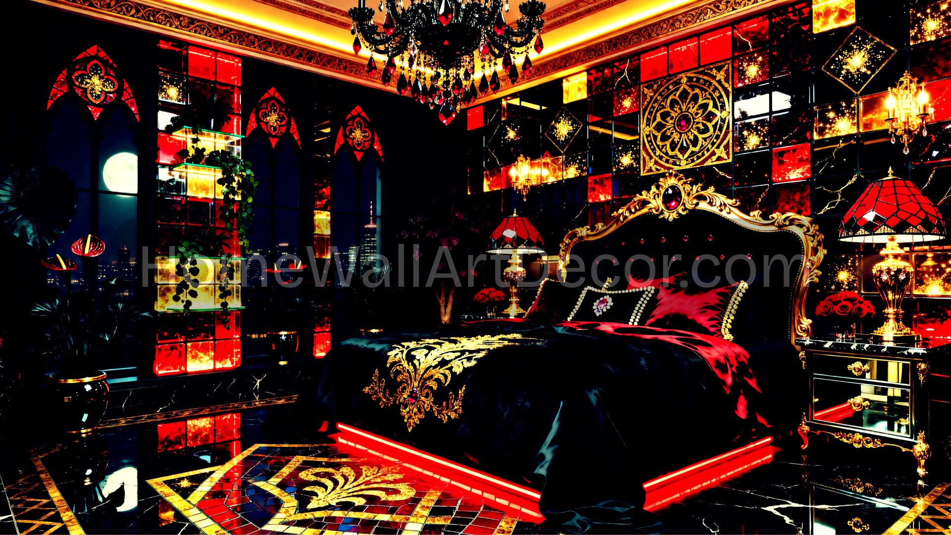 This artwork is a masterclass in texture and mood. The room is bathed in the glow of intricate stained glass panels in deep crimson and amber, casting a romantic, mysterious light across the mosaic floor. The centerpiece—a regal bed draped in black velvet and silk—sits beneath a crystal chandelier that drips with ruby accents.