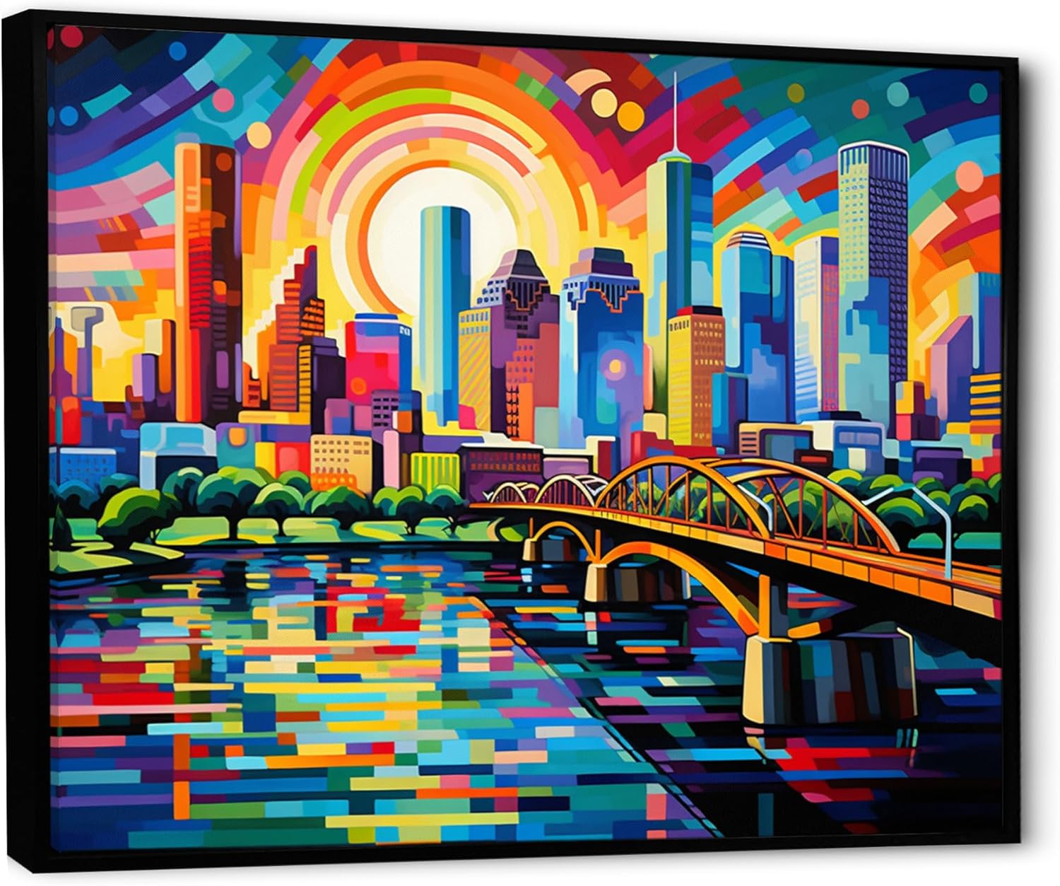 Transform your living space with the vibrant and dynamic ‘Houston Wall Art – Colorful Houston Cityscape Wall Decor.’ This stunning piece captures the essence of Houston’s bustling city life through a vivid display of colors and geometric patterns. The artwork features a captivating skyline of Houston, with its iconic buildings and landmarks rendered in a kaleidoscope of bright hues. The reflection of the cityscape in the water below adds depth and movement, creating a mesmerizing visual experience that will enchant any viewer.