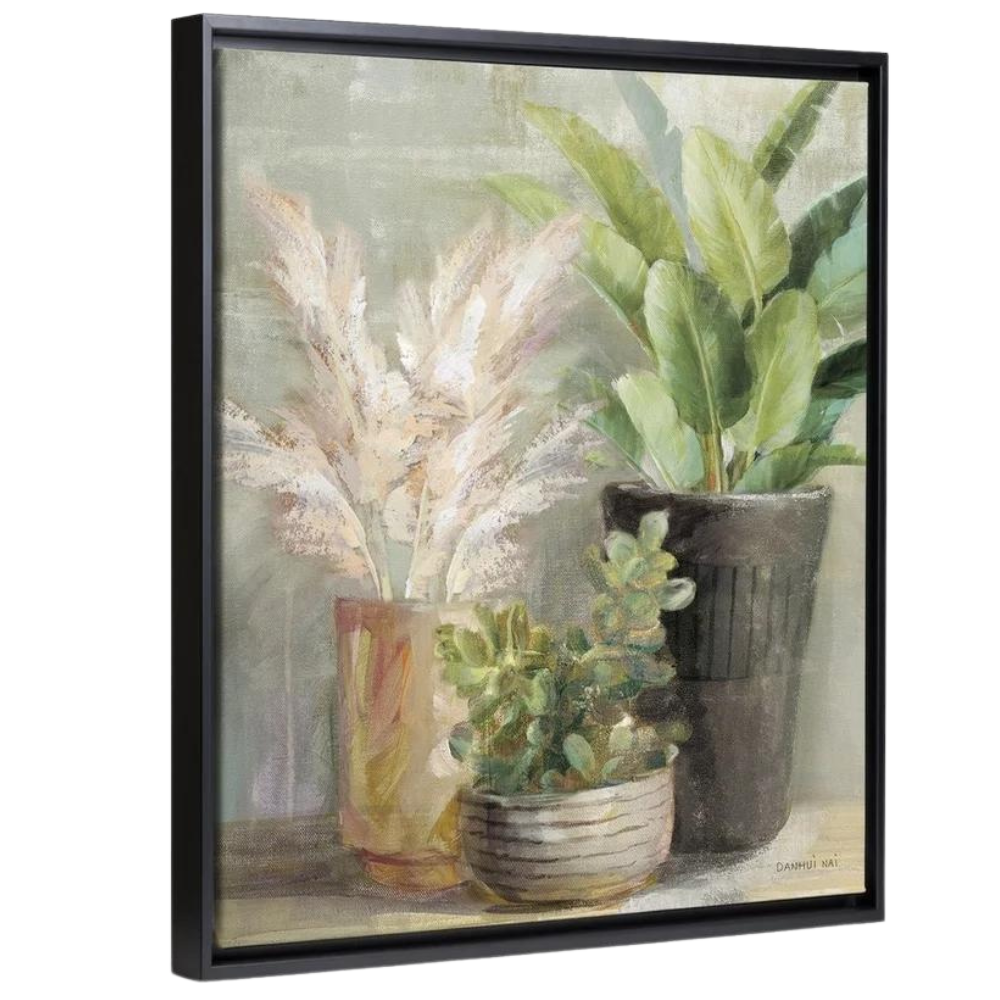 Crafted with high-quality materials, this artwork is printed on durable canvas, ensuring that it retains its vibrant colors and intricate details over time. The canvas is stretched over a solid wood frame, offering both stability and a polished, finished look. The subtle texture of the canvas adds depth to the piece, enhancing the lifelike quality of the plants and making them appear almost three-dimensional.