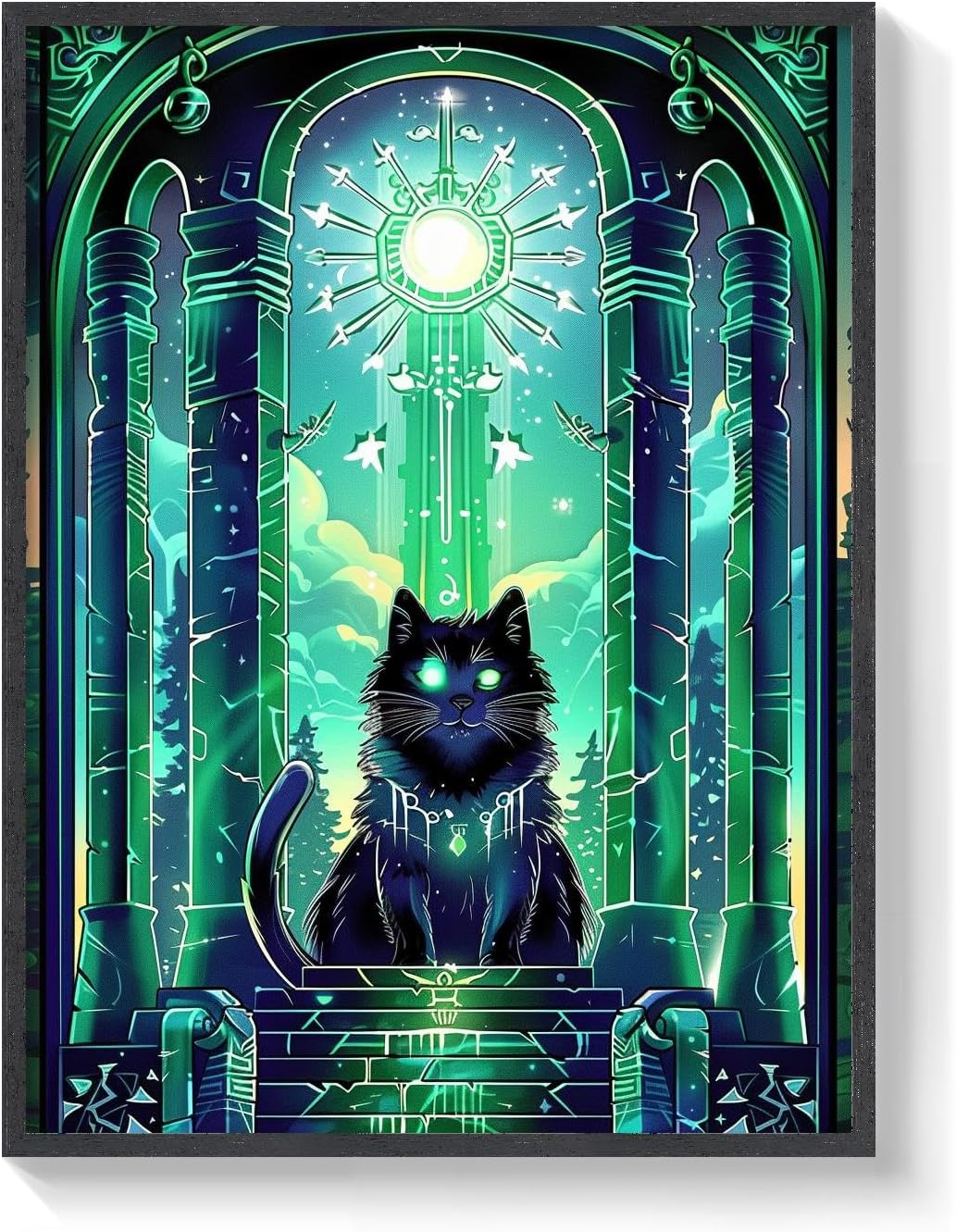 This Magical Tarot Card Wall Art features a mesmerizing blend of greens, blues, and blacks, coming together in a vivid display that captures the essence of mystical strength. The glowing green eyes of the cat stand out against the intricate background of ancient ruins and arcane symbols, creating a powerful focal point in any room. The artwork’s color palette evokes the deep forests and hidden groves where magic still lingers, making it a perfect addition to spaces that embrace the whimsical and the mystical.
