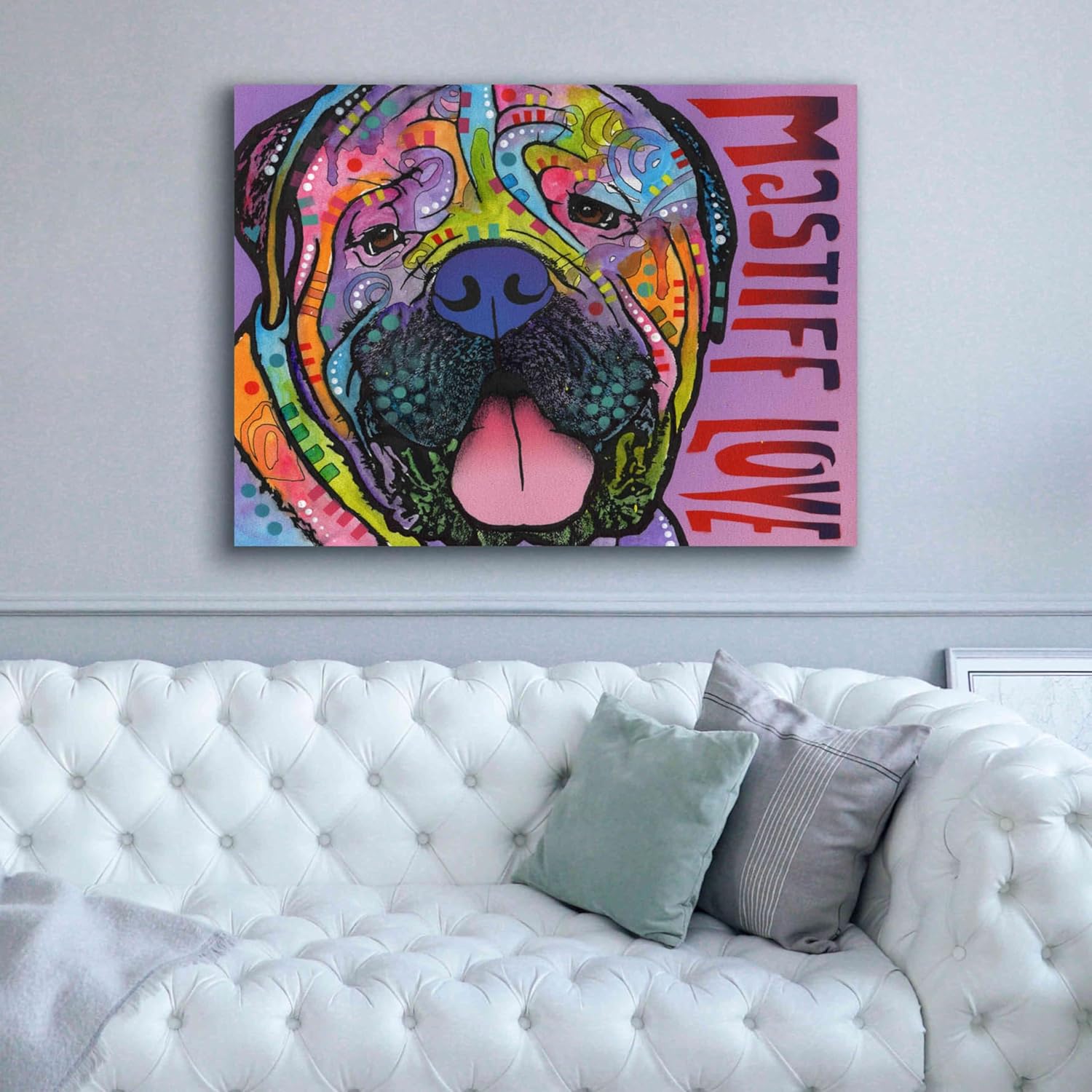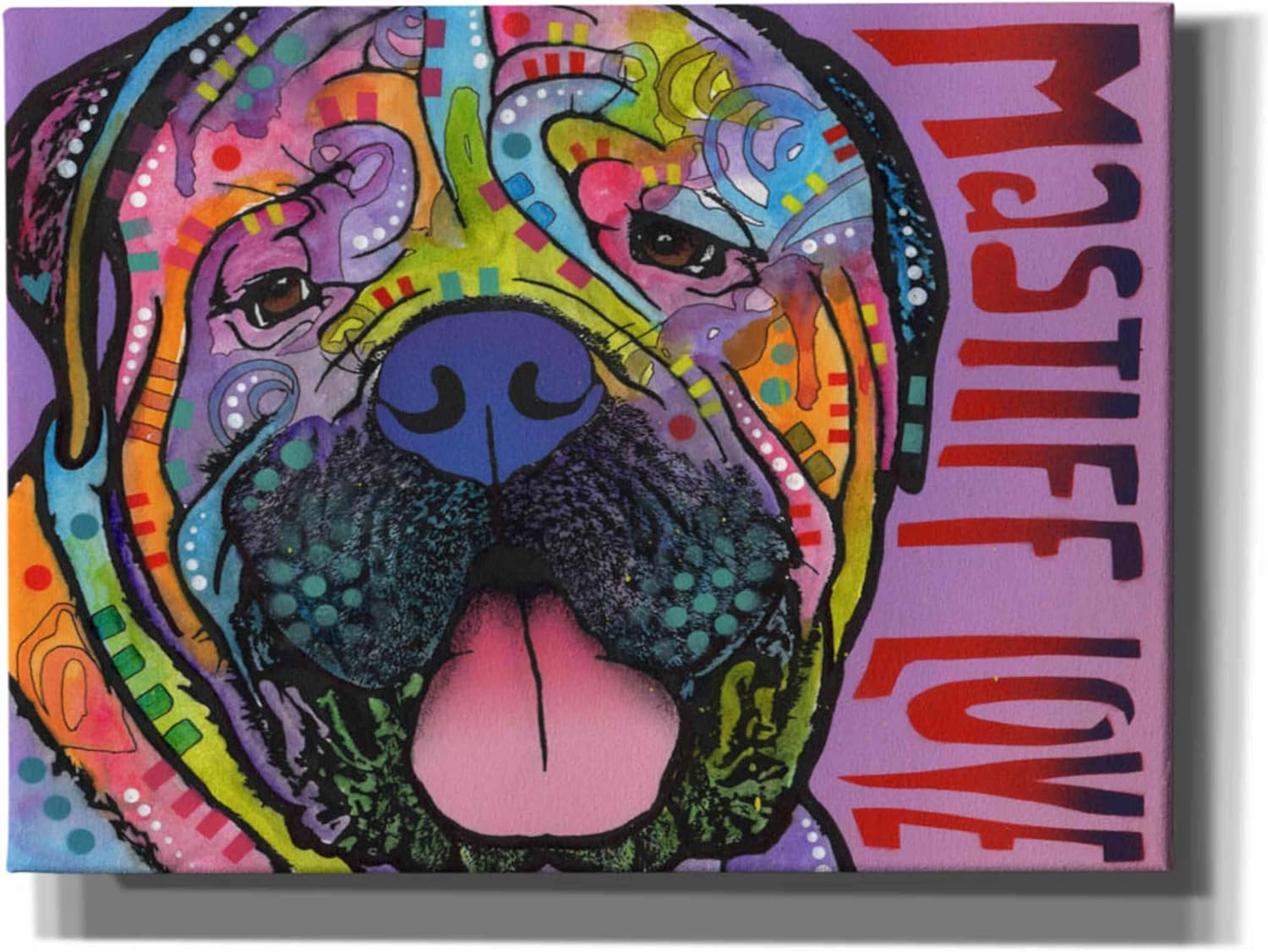 Celebrate the majestic presence of the Mastiff with the vibrant and energetic Mastiff Love Psychedelic Mastiff Dog Wall Art by Dean Russo. This captivating piece combines bold colors and intricate patterns to bring out the strong and loving nature of the Mastiff breed. With a rich palette of purples, greens, and reds, this artwork creates an impactful visual experience that will instantly transform any space. The Mastiff’s expressive face is depicted with a blend of realism and abstract flair, capturing both the strength and gentleness of this beloved breed.