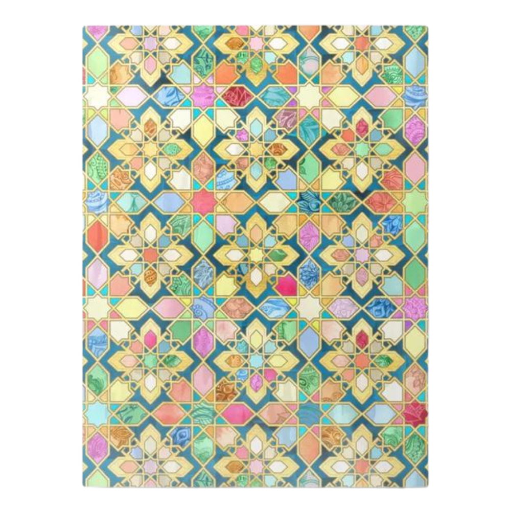 The striking use of rich, jewel-toned colors like emerald greens, sapphire blues, and ruby reds is accented with touches of gold, bringing a vibrant energy to any space. The detailed craftsmanship of the design mimics the complex geometry of authentic Moroccan tile work, creating a mesmerizing visual effect that draws you in with its depth and intricacy. Whether you’re looking to add a pop of color or create a focal point in a room, this piece delivers a perfect balance of artistry and elegance.