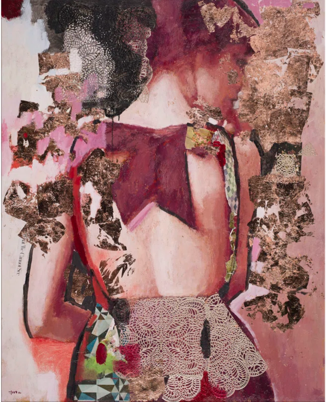 “Uncovered Glam” is not just a painting; it’s a journey into a world where artistry and imagination reign supreme, where every hue and texture is meticulously crafted to celebrate the multifaceted nature of elegance. Lundy’s impeccable artistry is accentuated by the harmonious infusion of precious metals, elevating the piece into a realm where art and luxury merge.