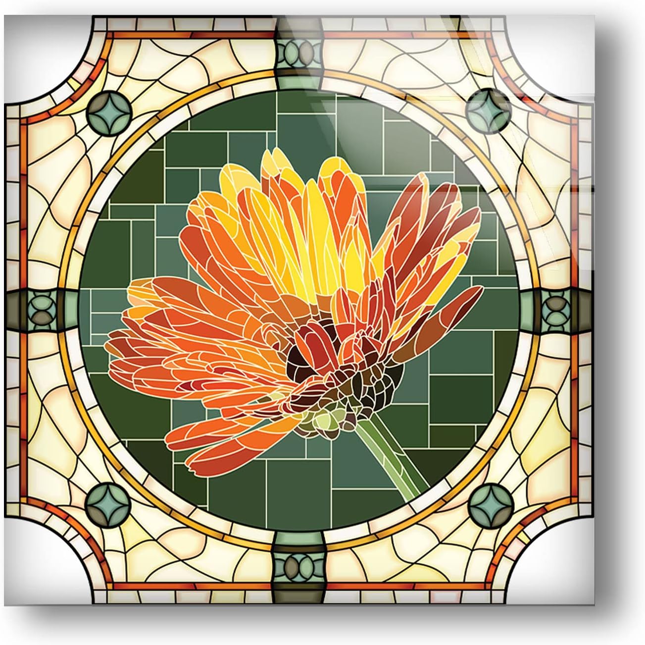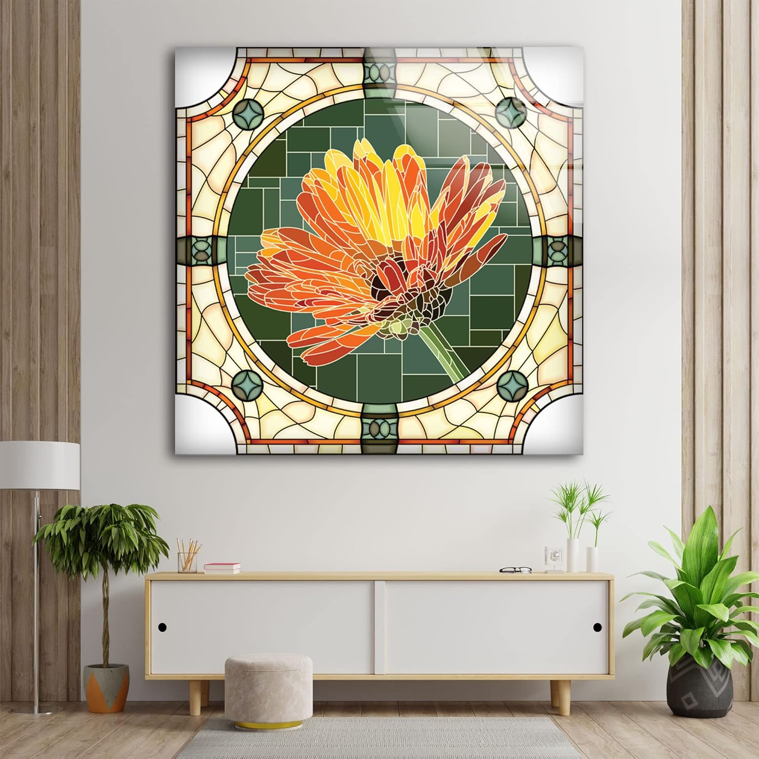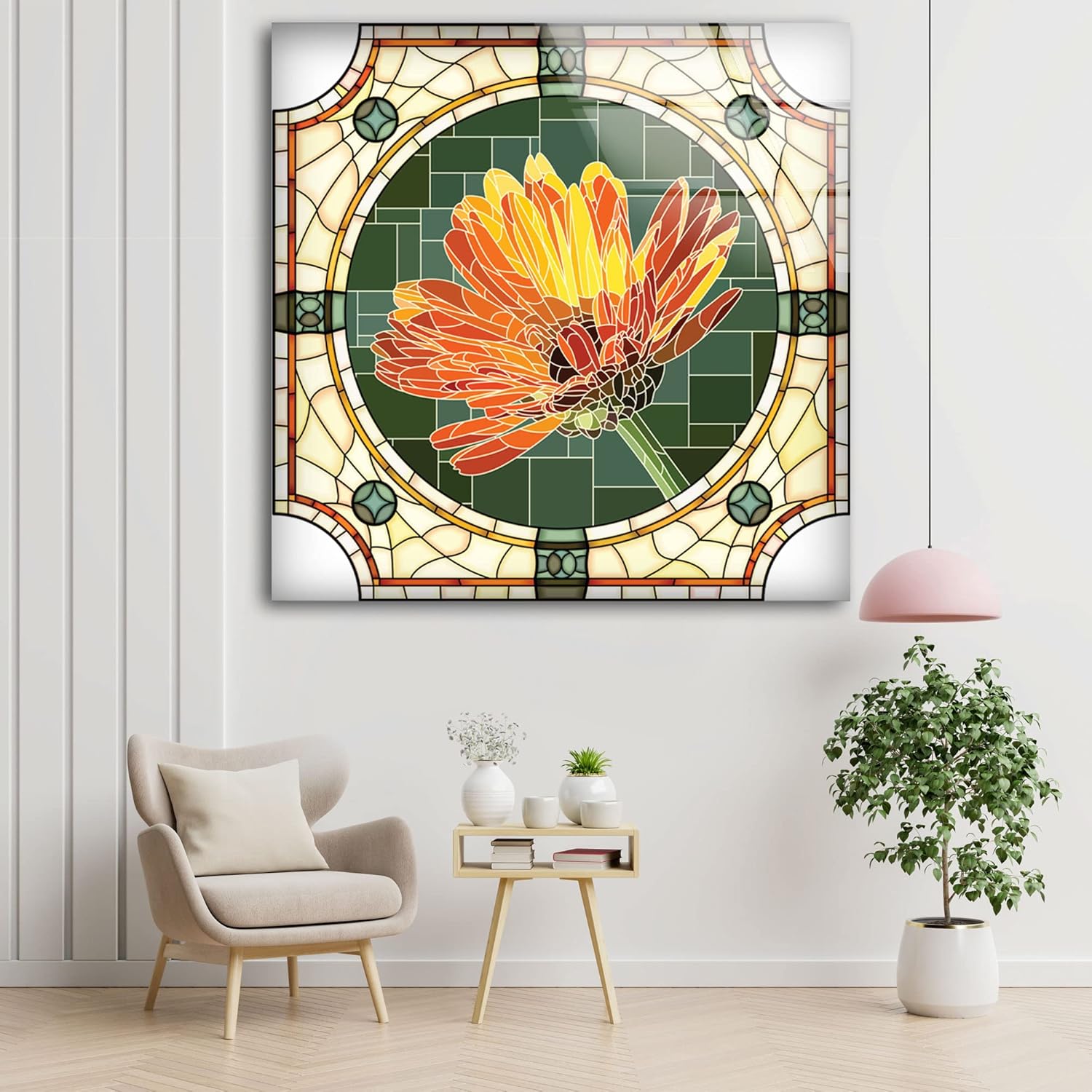 Enhance your home with the Orange Flower in Stained Glass: Floral Tempered Glass Wall Art. This tempered glass wall decor combines the beauty of nature with the elegance of stained glass art, creating a unique and captivating decor element. Let this artwork bring a touch of sophistication and vibrant energy to your home.