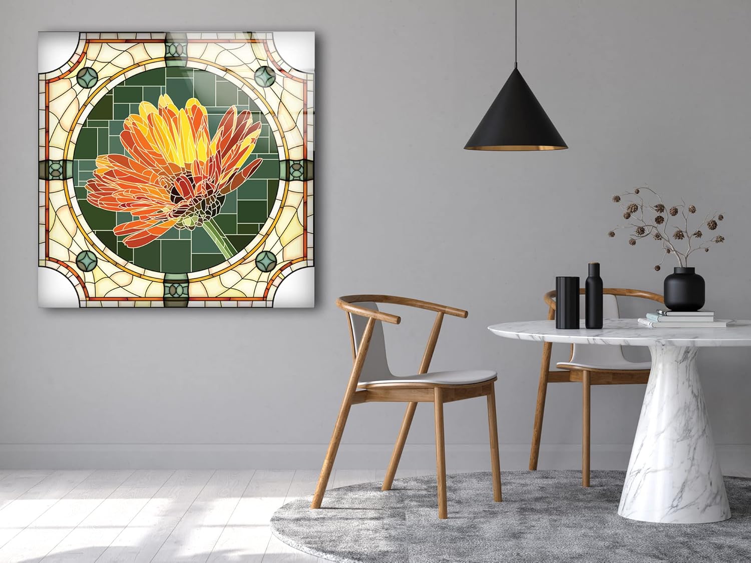 Ideal for various settings, the Orange Flower in Stained Glass: Floral Tempered Glass Wall Art can be displayed in the living room, bedroom, dining room, or even the office. Its versatile design complements a wide range of interior styles, from modern to traditional, adding a touch of elegance and charm to your decor. Whether you want to create a serene ambiance or a vibrant focal point, this tempered glass wall decor is perfect for achieving your desired look.