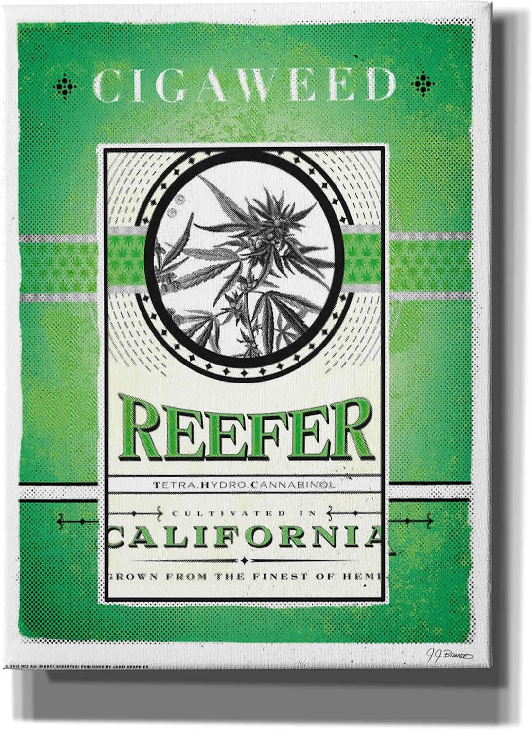 The color scheme of this artwork is both bold and balanced, with varying shades of green creating a sense of depth and dimension. The use of black and white accents adds contrast, making the central image pop while maintaining a cohesive, vintage-inspired aesthetic. The playful text and intricate details are expertly rendered, capturing the essence of a time when marijuana was both celebrated and stigmatized. This piece is perfect for those who appreciate art that challenges norms and sparks discussion.