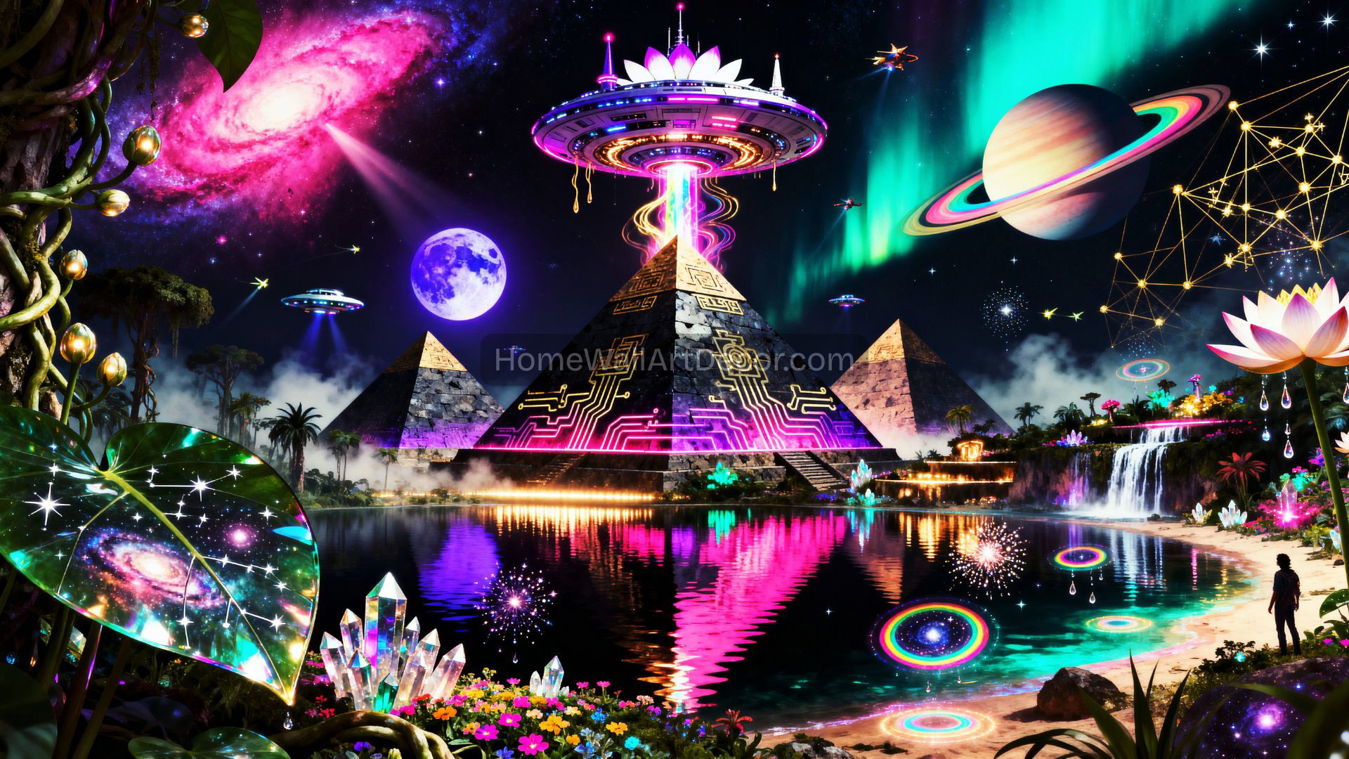 You stand on the shore of a transformed reality. Above the great pyramid, a luminous UFO mothership hovers in silent communion, its lotus-petaled dome radiating frequencies that awaken stone and soul alike. A spiral of iridescent energy connects ancient monument to extraterrestrial craft, suggesting this is not invasion but homecoming, not first contact but reunion. Pink nebulae swirl across impossible skies while auroras dance in teal and magenta. A ringed planet hangs low on the horizon, witnessing. Sacred geometry portals ripple across reflective waters. Crystalline formations pulse with inner light. This pyramid UFO art does not depict science fiction. It captures the moment humanity remembers.