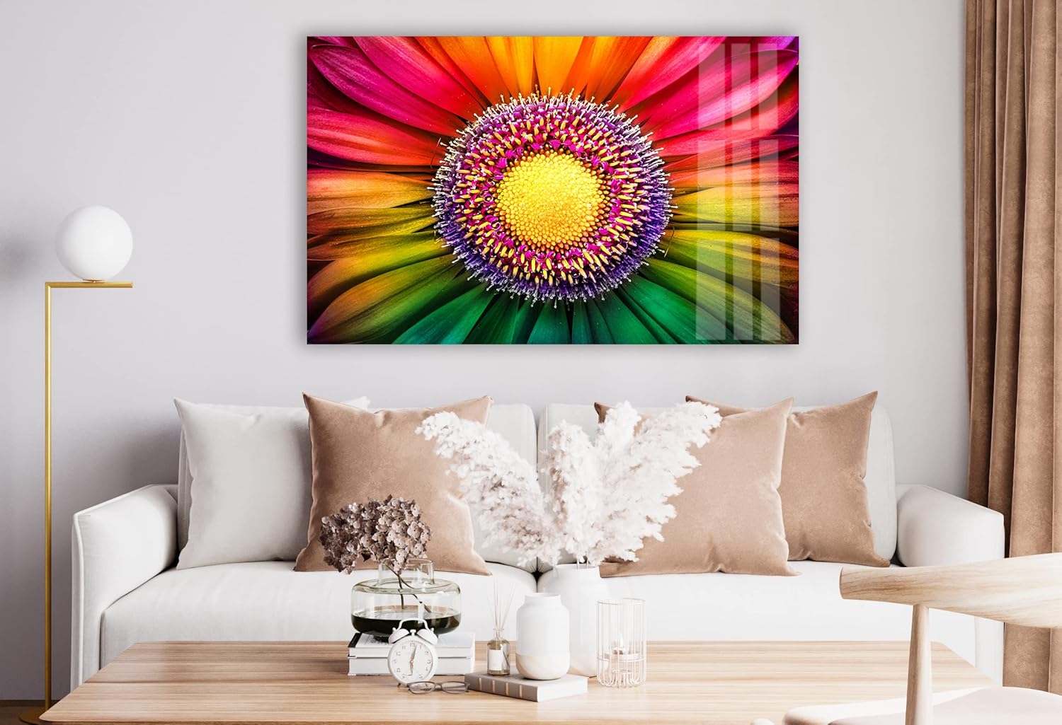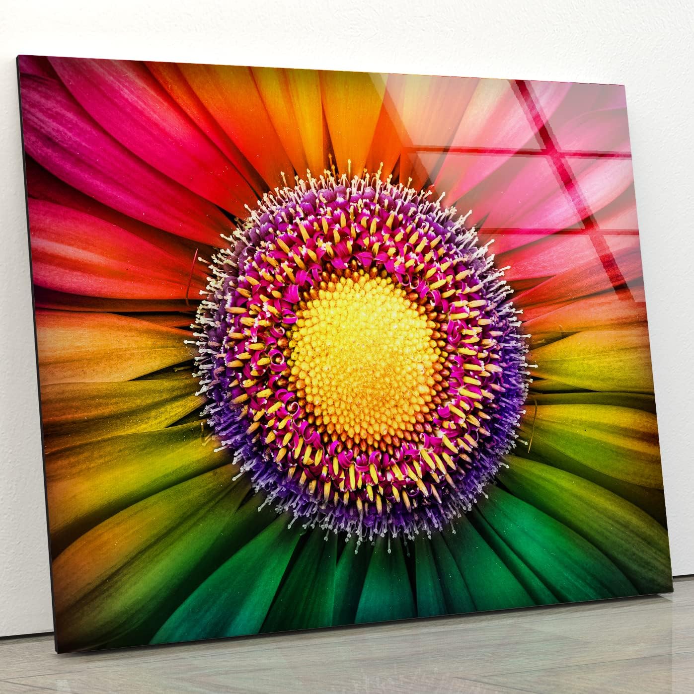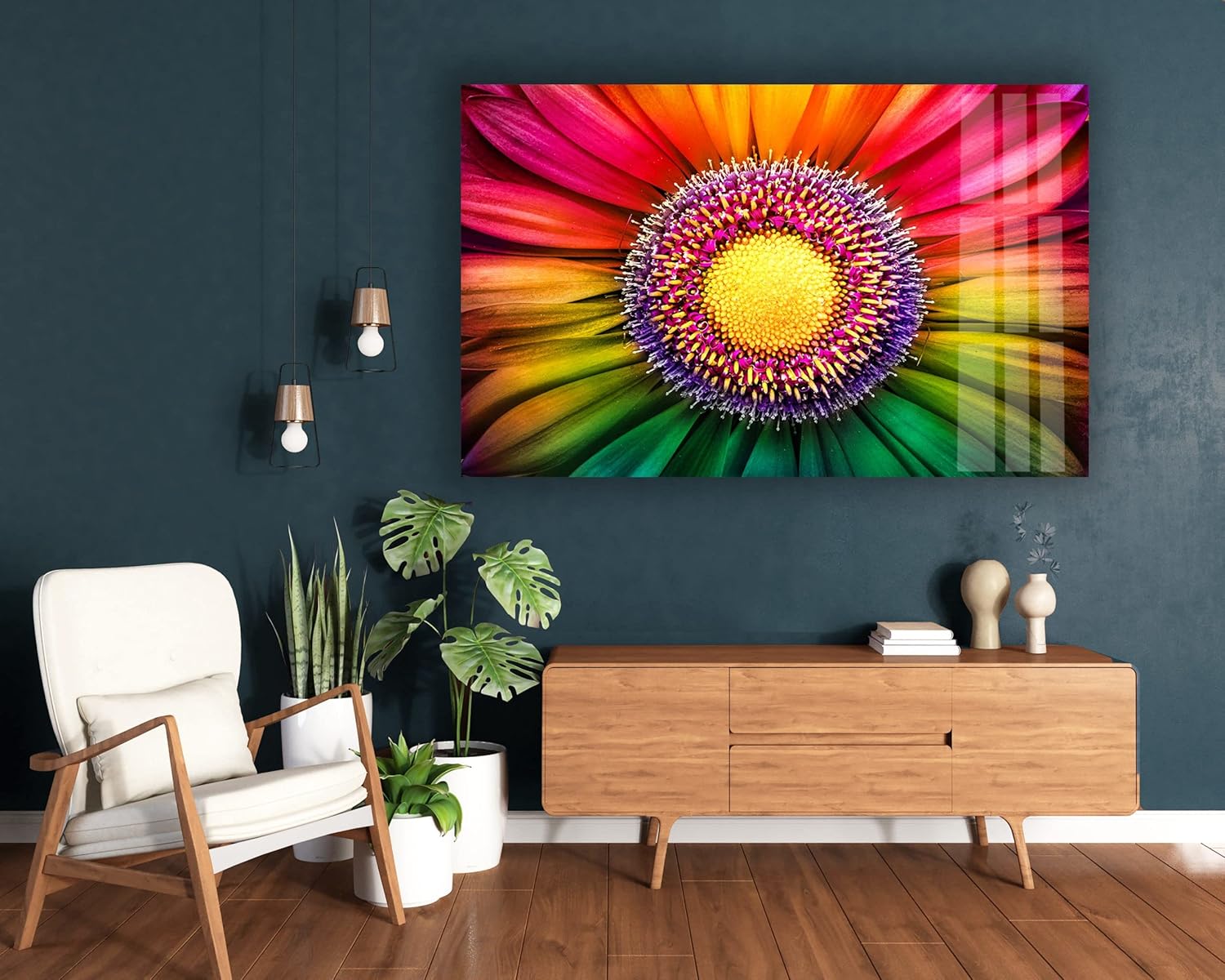 Incorporating this Rainbow Flower Wall Art into your home decor is effortless. Hang it in a well-lit area to enhance the vibrancy of the colors, or place it in a space that needs a touch of brightness and cheer. The dynamic design and bold colors make it an excellent choice for creating a lively and inviting atmosphere. Whether you’re looking to refresh your home or add a standout piece to your collection, this artwork is the perfect choice.