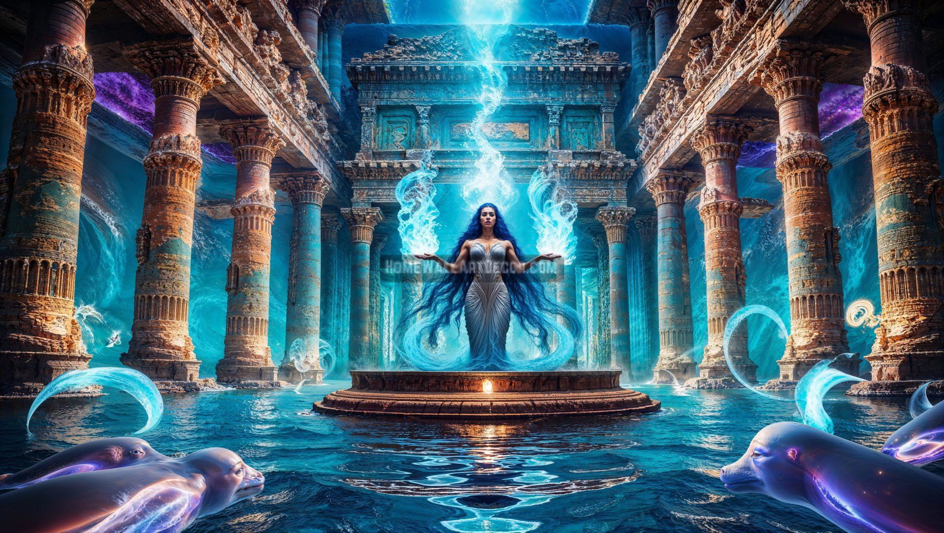 Step into the realm of divine tranquility with Woman Purifying Meditation – Sacred Blue Flame Wall Art by Pamela Arsena. This ethereal digital artwork exudes serenity, power, and spiritual purity, featuring a meditative woman surrounded by cascading blue flames that symbolize cleansing energy. The intricate architectural columns and shimmering water create a harmonious balance between ancient mysticism and modern spirituality, making this piece a mesmerizing addition to any home or sacred space.