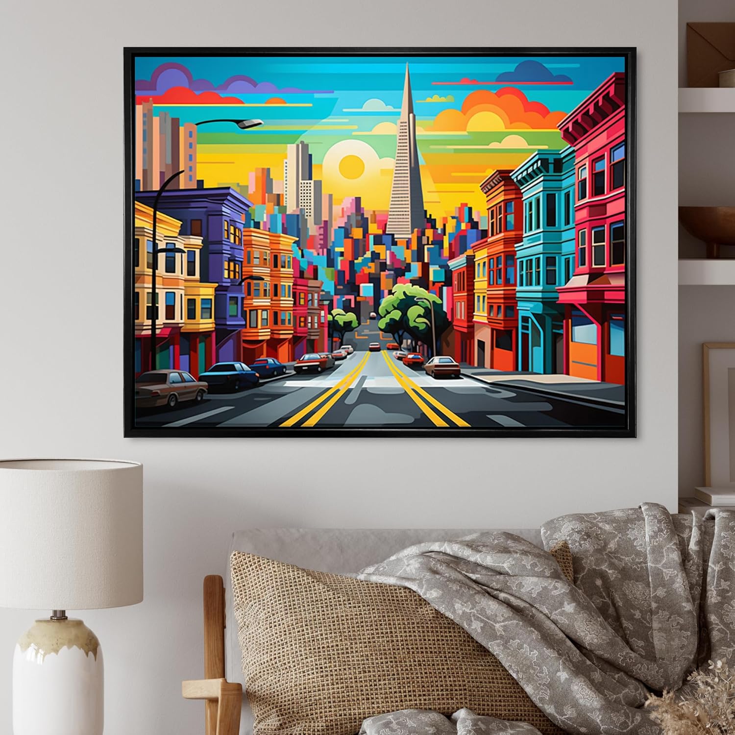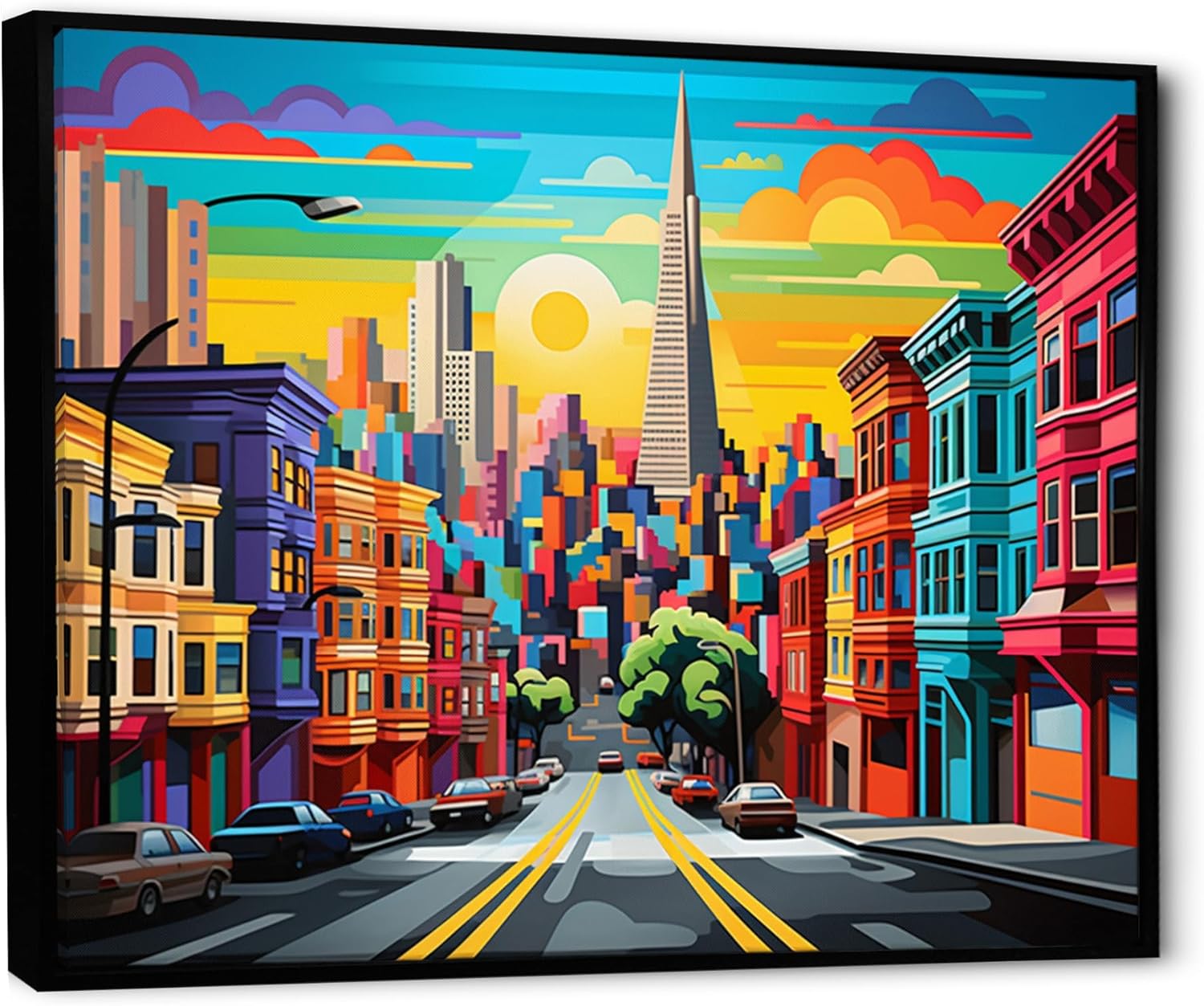 Immerse yourself in the vibrant energy of the iconic San Francisco skyline with our ‘San Francisco Wall Art – Colorful Industrial Cityscape Wall Art.’ This stunning piece captures the essence of the bustling city, featuring a dynamic blend of bold colors and intricate architectural details. The artwork showcases the famous Transamerica Pyramid amidst a lively urban landscape, bringing the spirit of San Francisco into your home.