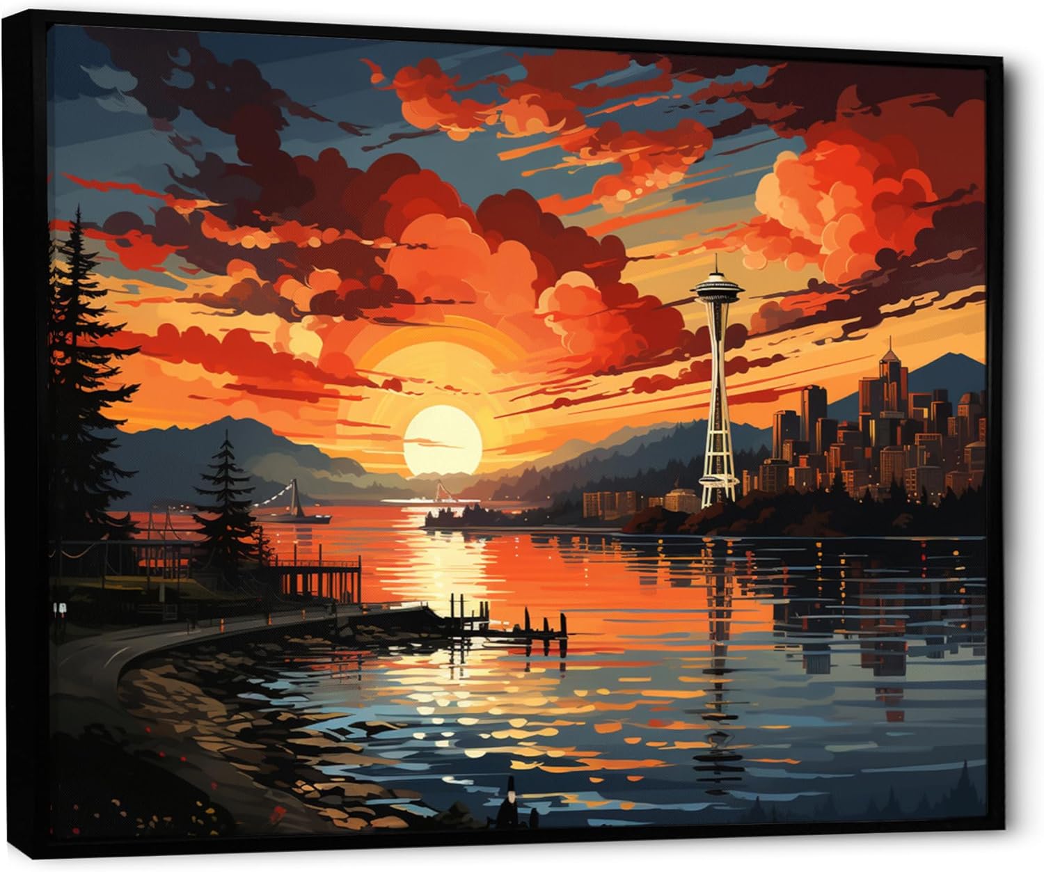 Transform your living space with the enchanting ‘Seattle Wall Art – Captivating Cityscape Industrial Wall Art.’ This stunning piece captures the iconic Seattle skyline at sunset, beautifully rendered in vibrant hues of orange, red, and gold. The majestic Space Needle stands tall against a backdrop of dramatic clouds and serene waters, creating a mesmerizing scene that exudes both tranquility and energy. The reflection of the cityscape on the water adds depth and movement, making this artwork a true focal point.