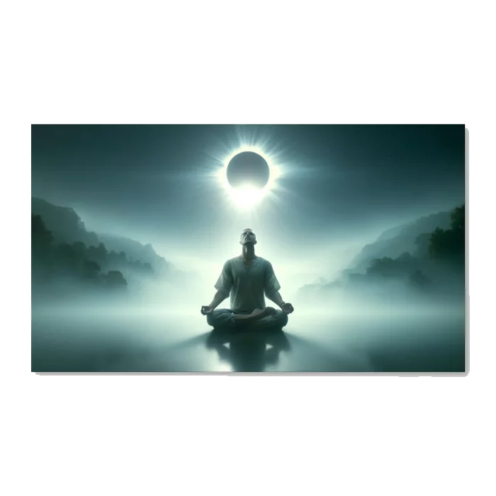 In this masterpiece, the meditative figure sits at the heart of an eclipse, embodying the calm at the center of celestial storms. The image resonates with those who seek peace in a bustling world and evokes the boundless quietude one can discover within. Arsena’s work is a dialogue between the seeker and the infinite, between the pulse of life and the timeless quiet of space. The stark light of the eclipse in the artwork symbolizes moments of clarity and the revelations that come when we align with nature’s rhythms.