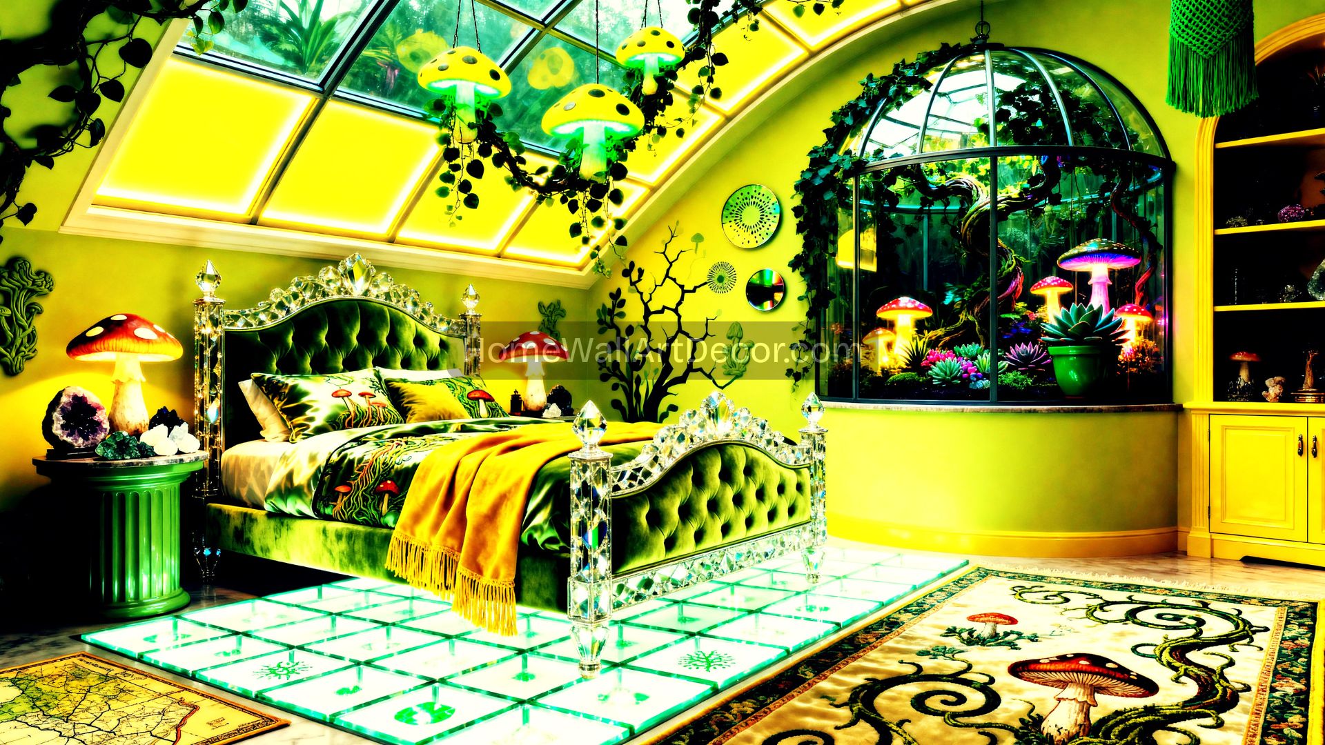 Look at what is happening in this image. Bioluminescent mushroom lamps in acid yellows and sunset pinks cast living light across moss-green velvet bedding. The bed frame itself appears constructed from faceted crystal, catching golden rays that pour through an enormous glass ceiling. Through an arched window, an enchanted garden pulses with neon fungi in colors that belong on distant planets. Vines trail from above like the room itself is breathing. Amethyst geodes and quartz clusters gather on the nightstand. A carpet woven with mushroom motifs anchors the fantasy without breaking the spell.
