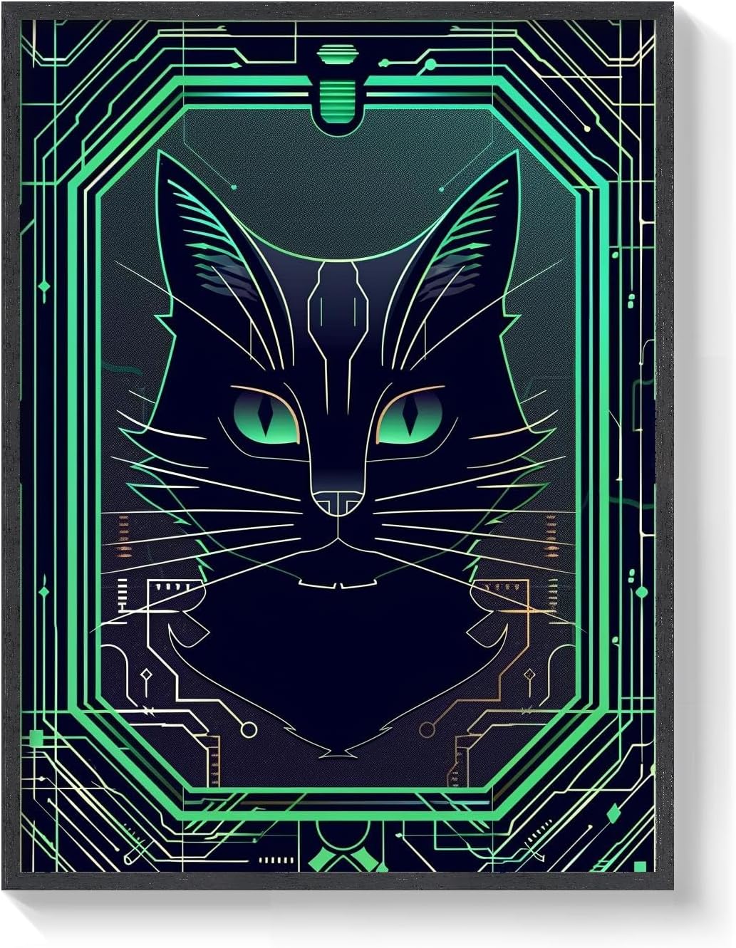 This Cat Tarot Wall Art is more than just a decorative piece; it is a portal into the mystical world. The vibrant green tones against a deep black background highlight the intricate design of the cat, symbolizing strength, independence, and intuition. The geometric patterns surrounding the cat evoke the circuitry of modern technology, making this piece a perfect fusion of the ancient and the contemporary. It’s a visual narrative that draws you in, igniting your imagination and inviting you to explore the deeper meanings hidden within its lines.