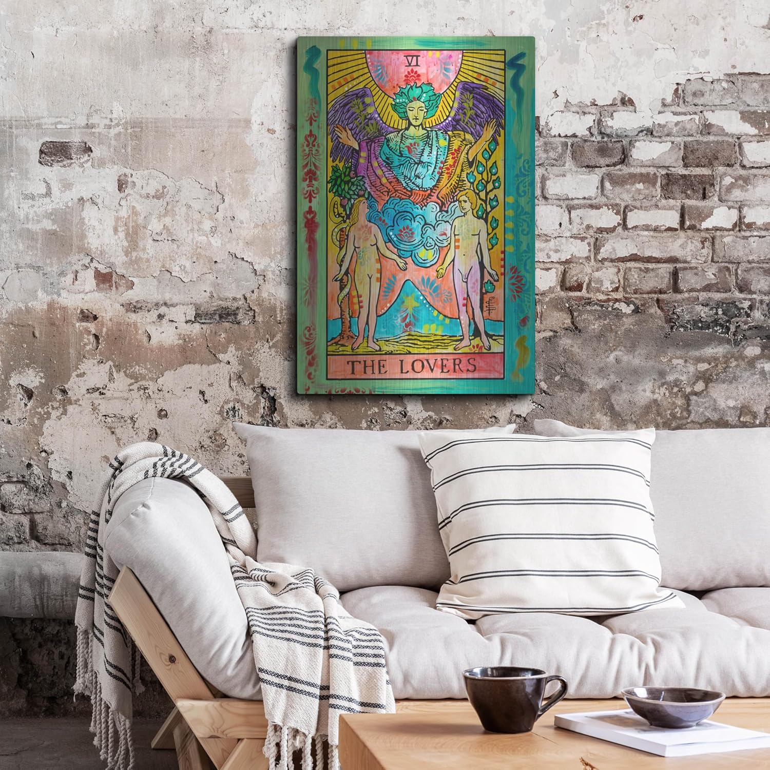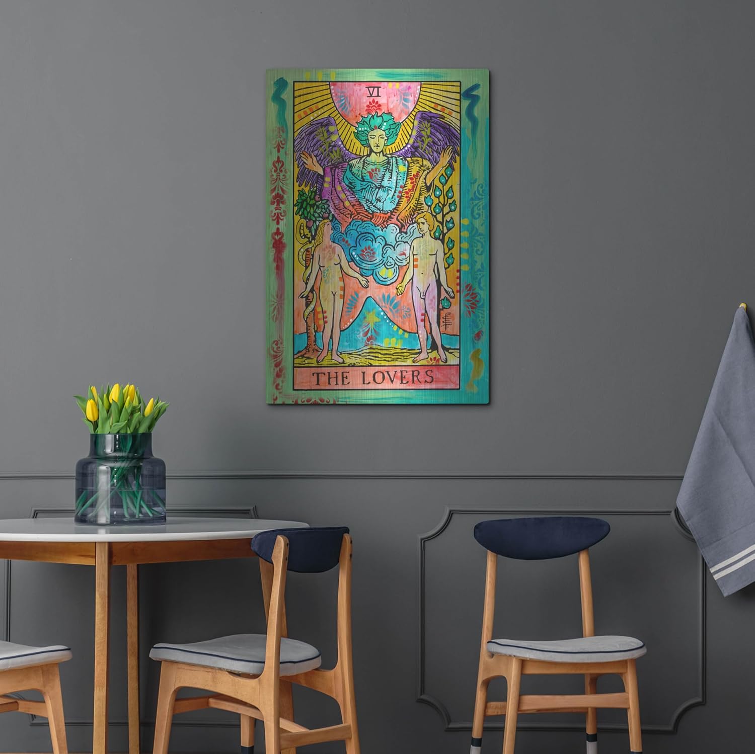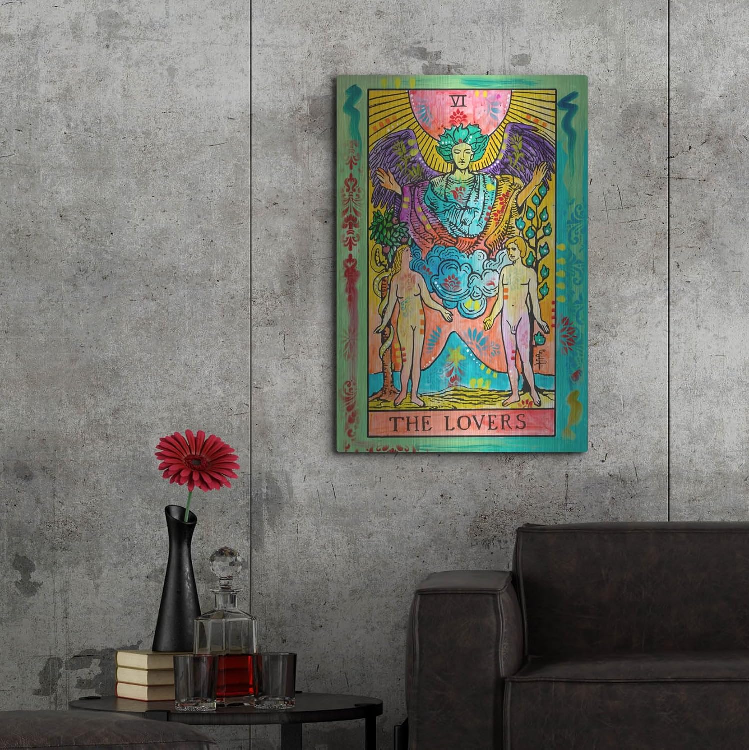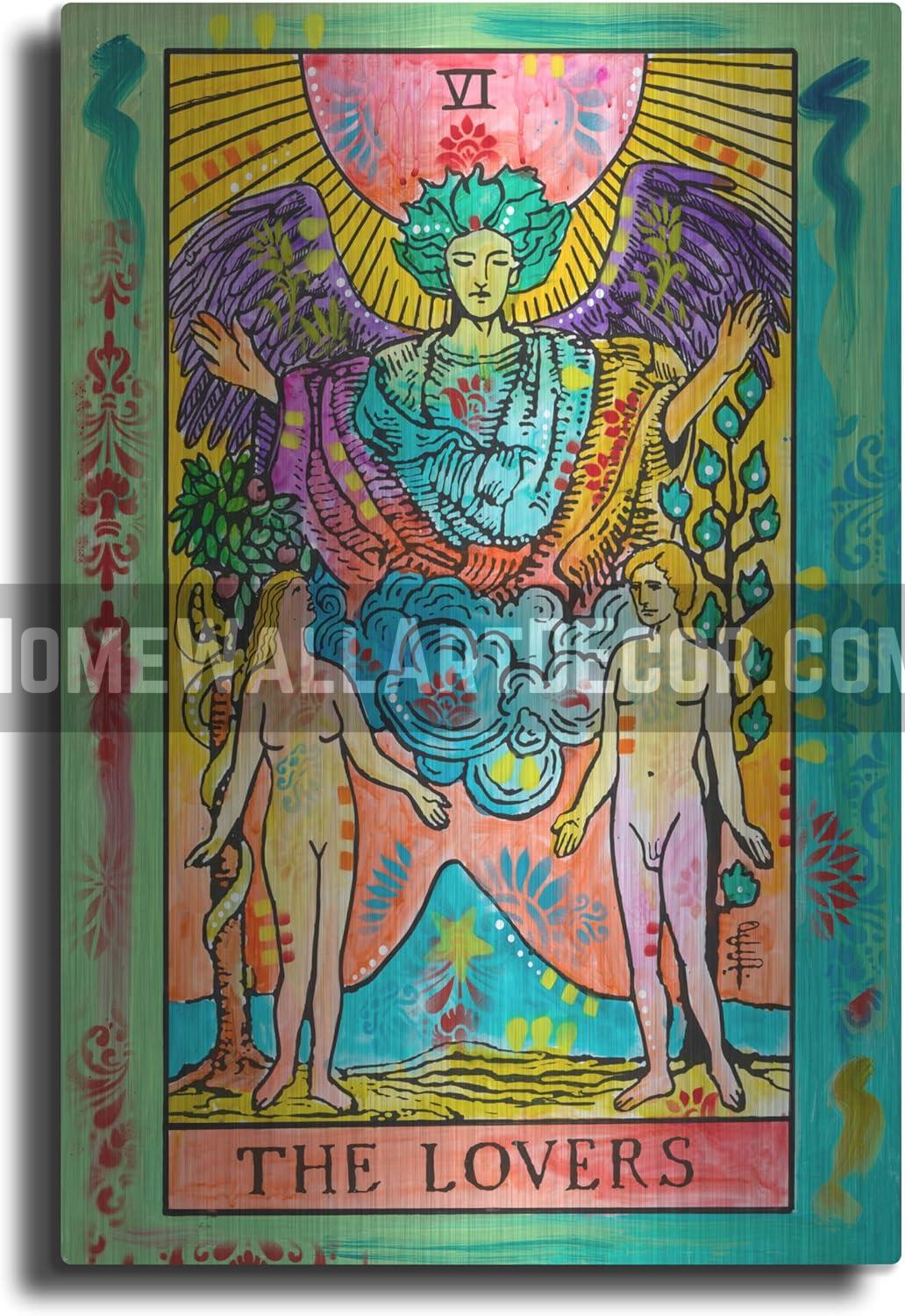 ive into the mystical world of tarot with The Lovers Tarot Card Wall Art by Dean Russo. This Dreamy Tarot Metal Wall Art brings the iconic imagery of The Lovers card to life, blending vibrant colors and intricate patterns that mesmerize the viewer. The bold hues of red, blue, and gold create a captivating contrast, drawing the eye and inviting contemplation. This piece is more than just wall decor; it’s an invitation to explore the deeper meanings of love, connection, and harmony in your life.