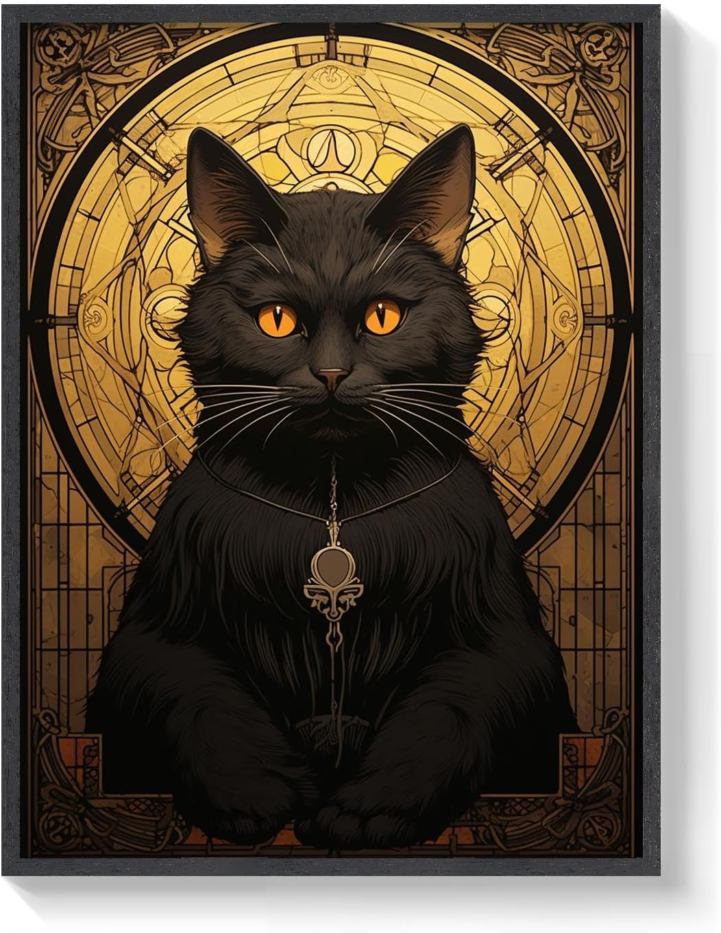 The style of this piece is a perfect blend of modern elegance and esoteric symbolism. The black cat, a powerful symbol of mystery and intuition, is depicted with an air of quiet strength and mastery. The warm golds of the mandala add a touch of sacred energy, making the artwork versatile enough to complement a variety of interior styles. Whether your decor leans towards the eclectic, modern, or bohemian, this piece will seamlessly integrate while adding a layer of depth and intrigue to your space.