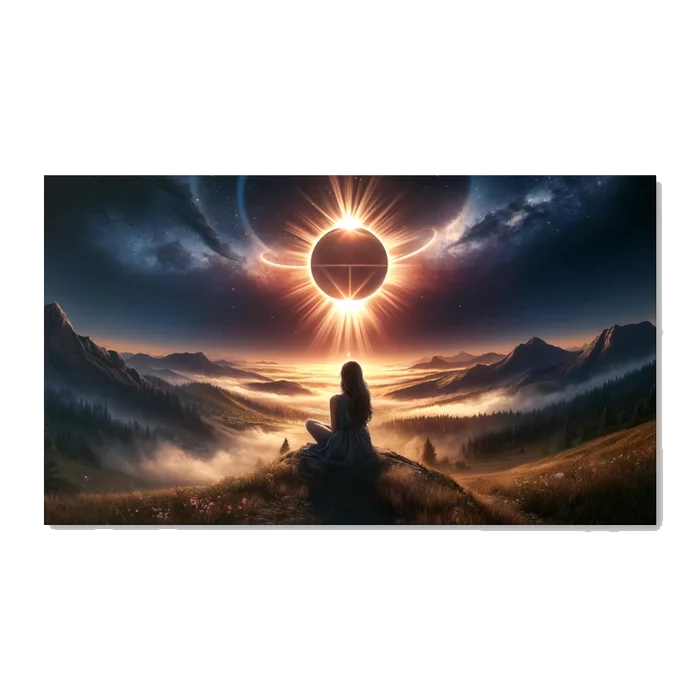 The “Sun’s Halo: Revelations at Twilight wall decoration” is a mesmerizing visual symphony that captures the profound beauty of a twilight world touched by the celestial wonder of a solar eclipse. This canvas portrays a solitary figure, seated in contemplative stillness, gazing upon the awe-inspiring sight of the day’s celestial sentinel obscured by a mysterious interloper. It is a moment frozen in time, where the natural and the supernatural, the known and the mystical, intertwine in a delicate dance of light and shadow.
