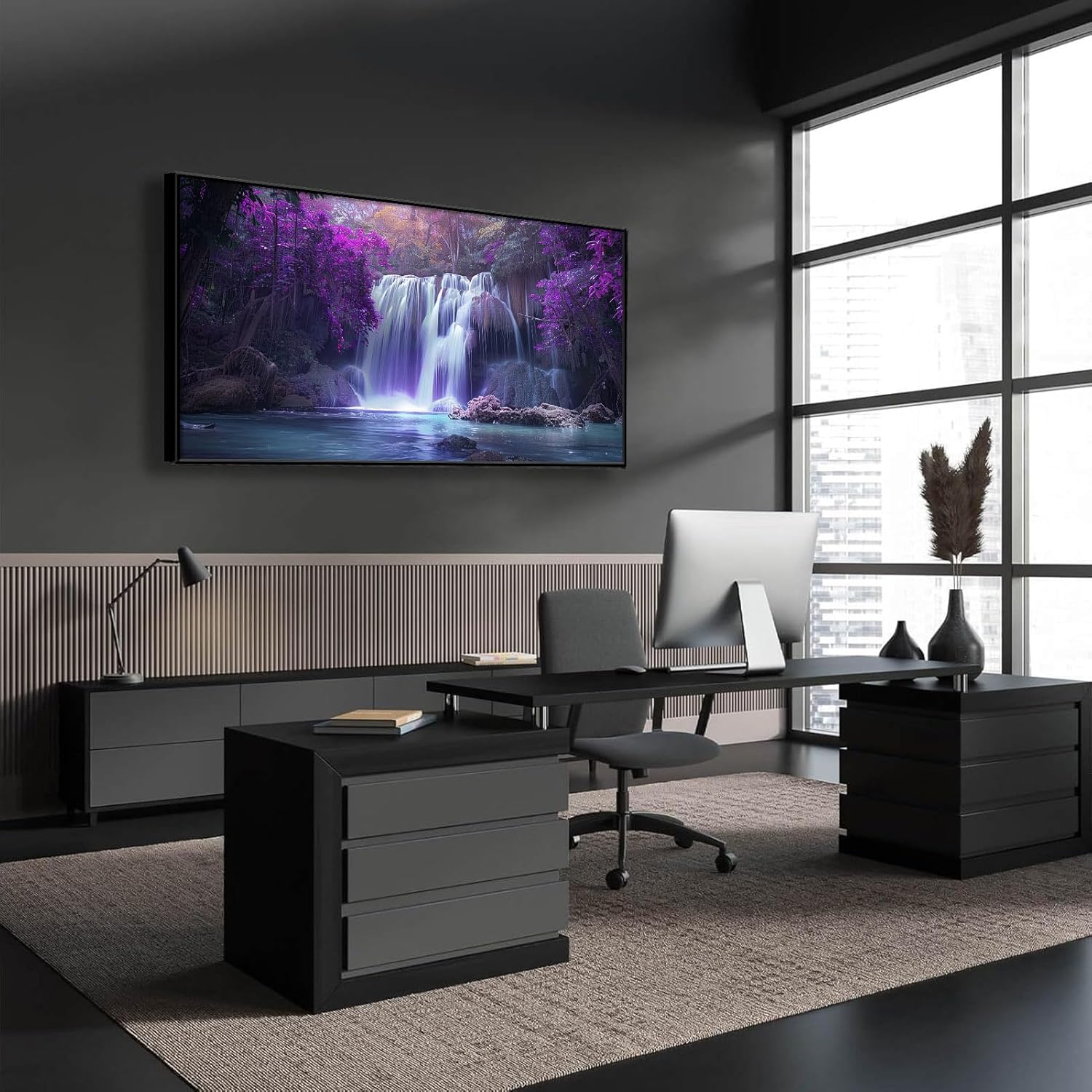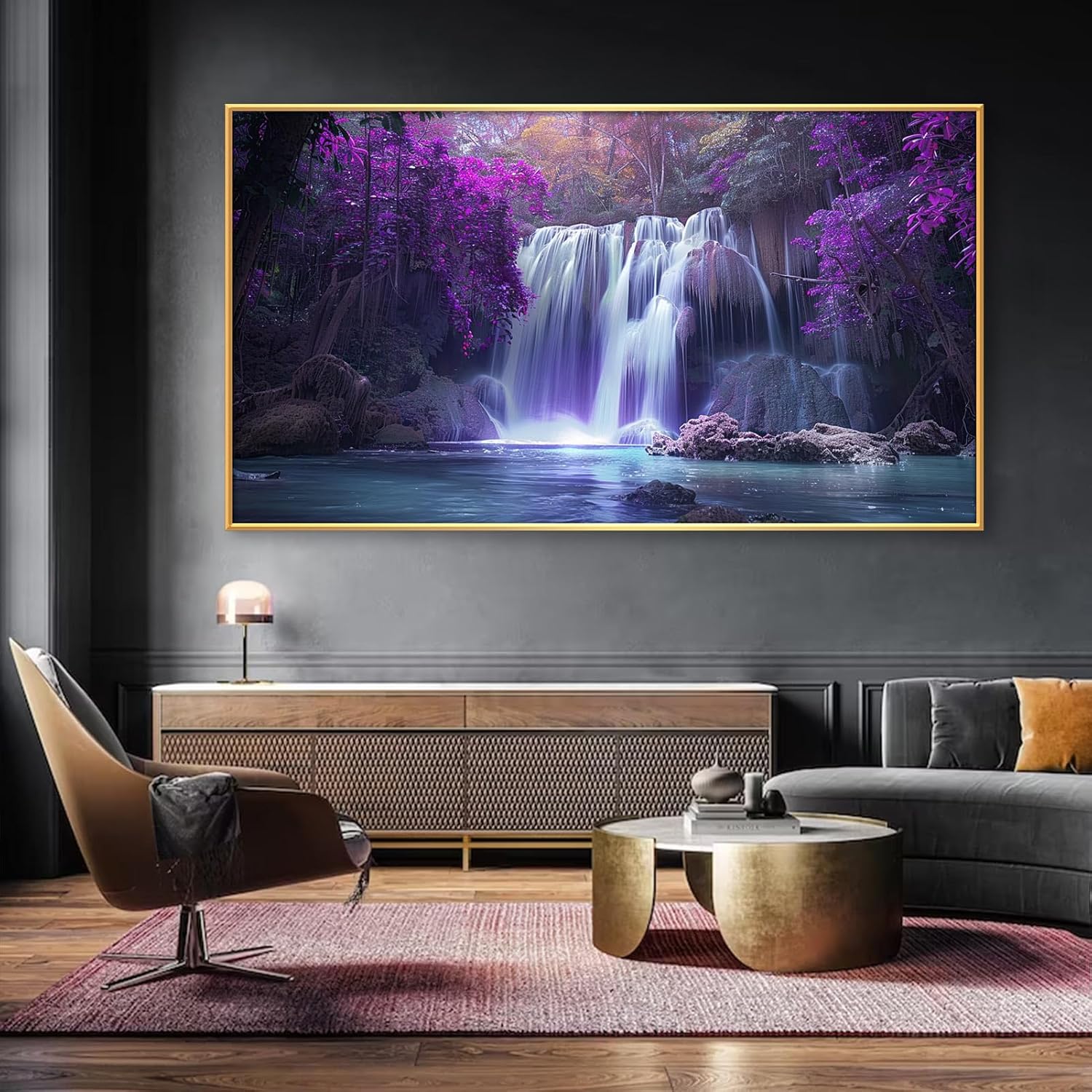 This piece of art is more than just a decoration; it is a gateway to a world of tranquility and beauty. The calming effect of the flowing water combined with the mystical purple trees makes it ideal for creating a peaceful environment in any setting. It is perfect for meditation spaces, reading nooks, or any area where you seek to unwind and escape the stresses of daily life.