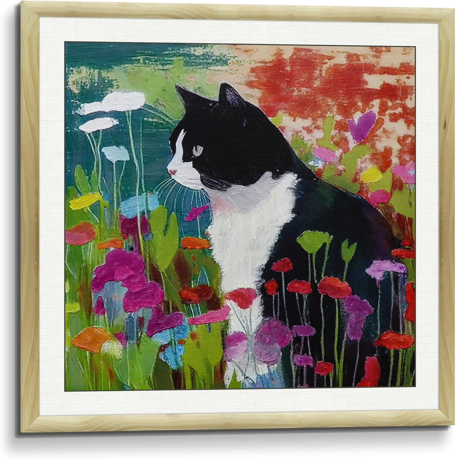 Immerse yourself in the whimsical beauty of nature with the Black & White Tuxedo Cat in Wildflower Field Wall Art. This striking piece features a delightful tuxedo cat nestled amidst a vibrant field of wildflowers, capturing the essence of untamed beauty and serenity. The harmonious blend of bold reds, purples, and greens against the deep black and white of the cat creates a visual masterpiece that draws you into a world where nature and elegance coexist. The colors are vivid and meticulously selected to evoke a sense of peace and tranquility, making it a perfect addition to any room.