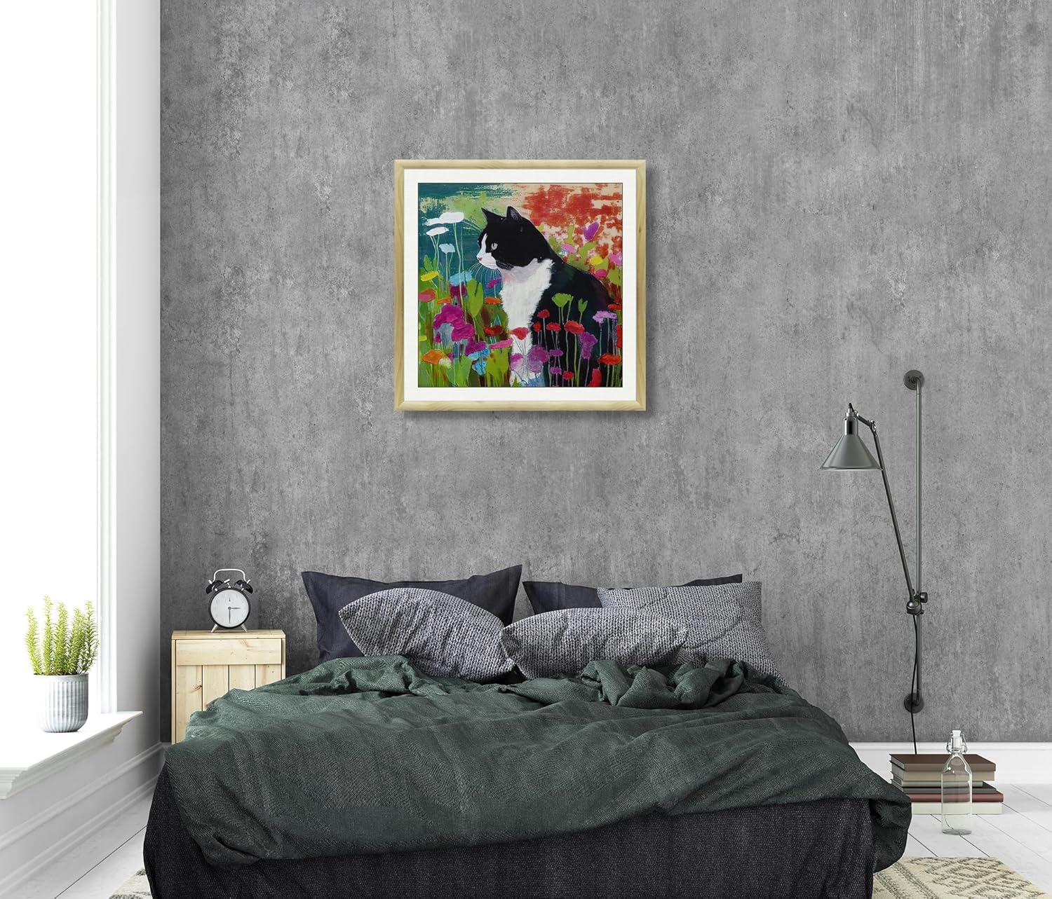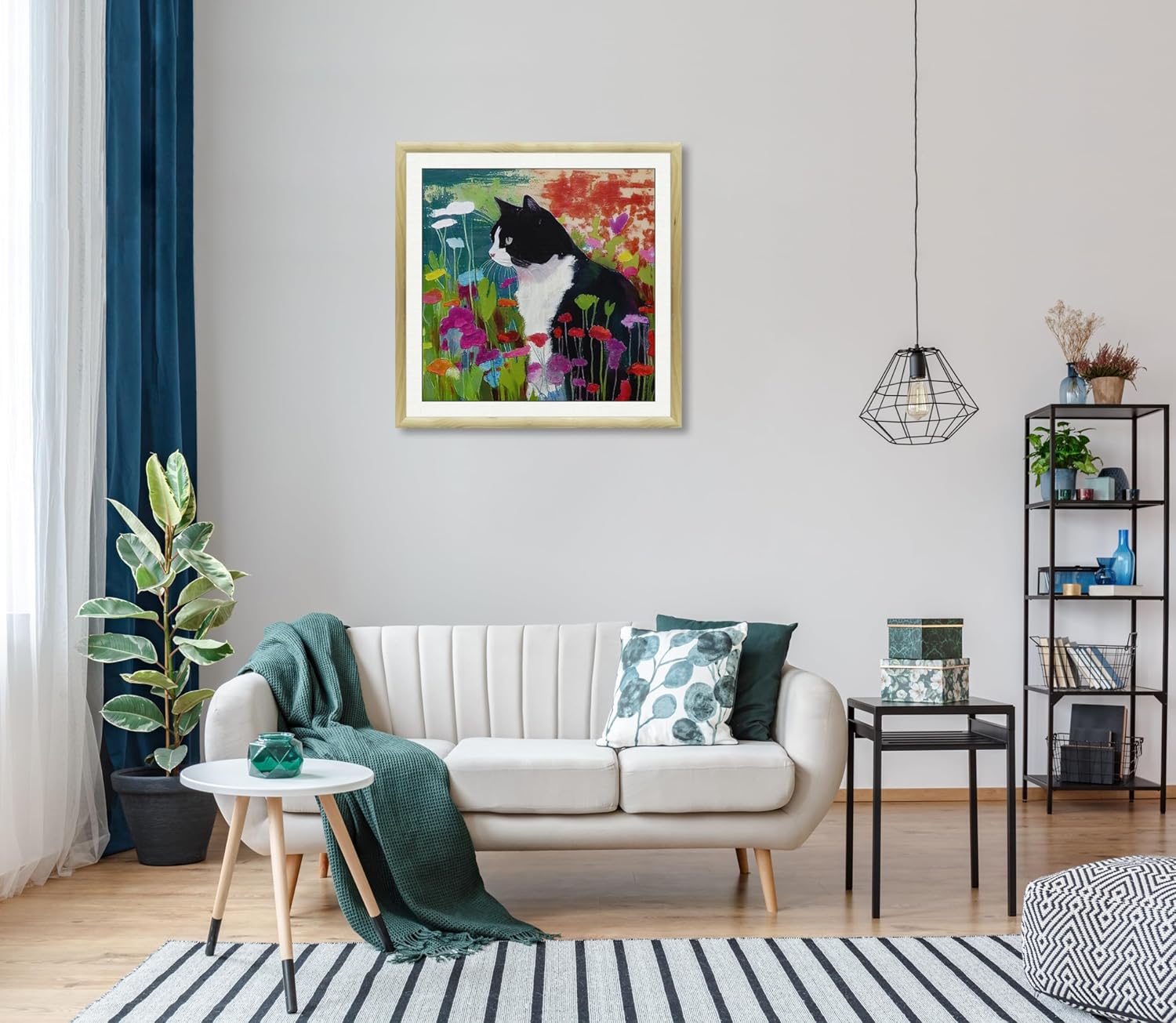 The style of this wall art is a beautiful marriage of realism and impressionism. The cat is depicted with a lifelike attention to detail, while the surrounding wildflowers burst forth with the energy and movement characteristic of impressionist art. This blend ensures that the piece will complement a variety of interior styles, from modern to rustic to bohemian. Whether you’re a cat lover or a nature enthusiast, this artwork will resonate with your love for the natural world.