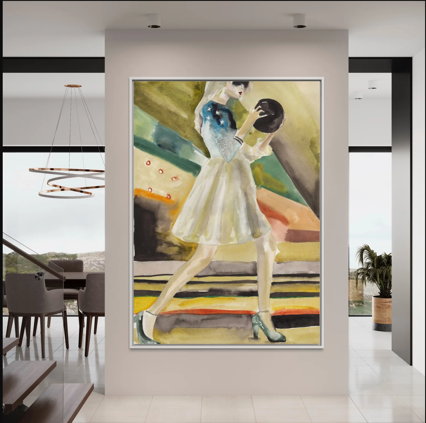 Step into the lanes of style and grace with “Won It In a Bowling,” a stunning watercolor masterpiece that captures the essence of a triumphant moment frozen in time. This exquisite painting is more than just an image; it’s a story, a memory of a night where fashion and fun collide on the glossy floors of a bowling alley.